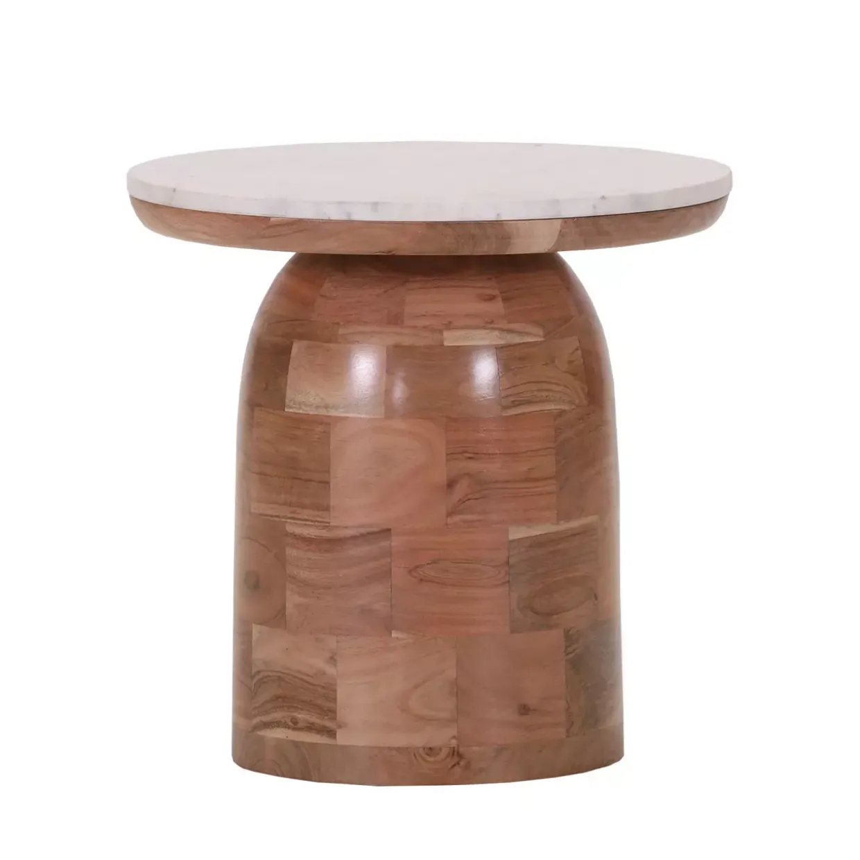 Die Kombination aus Holz und Stein schafft eine harmonische Balance zwischen Natur und Moderne. Die warme Ausstrahlung des Akazienholzes ergänzt sich perfekt mit der kühlen Eleganz des Marmors. Diese Mischung macht den Beistelltisch zu einem vielseitigen Möbelstück, das in verschiedenen Wohnbereichen eingesetzt werden kann.