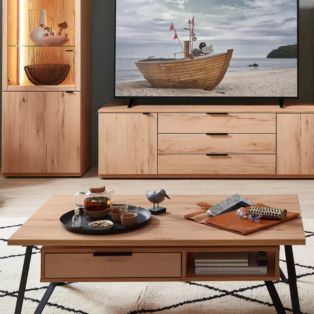 Eleganz in modernem Stil wird durch die Farbkombination aus Balkenbuche Nachbildung und Schwarz verkörpert. Der rechteckige Couchtisch setzt Akzente in Ihrem Wohnzimmer und überzeugt durch seine klare Linienführung. Eine sorgfältig gearbeitete Tischplatte mit 2 mm ABS-Kante bietet nicht nur Langlebigkeit, sondern auch ästhetischen Reiz.Praktikabilität trifft auf Design – der Couchtisch verfügt über einen funktionalen Unterbau sowie eine Schublade, die zusätzlichen Stauraum für Ihre Wohnaccessoires bietet. In der Konstruktion aus Holzwerkstoff und Metall vereinen sich Robustheit und eine moderne Ästhetik, die sich nahtlos in unterschiedliche Einrichtungsstile integrieren lässt.Die Kombination aus Materialien und Farben schafft ein harmonisches Gesamtbild. Der Tisch lädt dazu ein, gemütliche Stunden im Wohnzimmer zu verbringen, sei es bei einem guten Buch oder beim Beisammensein mit Freunden und Familie. Mit seiner durchdachten Gestaltung und hochwertigen Verarbeitung ist der Couchtisch mehr als nur ein Möbelstück – er ist ein stilvolles Element, das Ihrem Wohnraum Charakter verleiht. Ob als Mittelpunkt Ihres Wohnzimmers oder dezente Ergänzung, dieser Tisch erfüllt vielfältige Ansprüche an Funktionalität und Design.