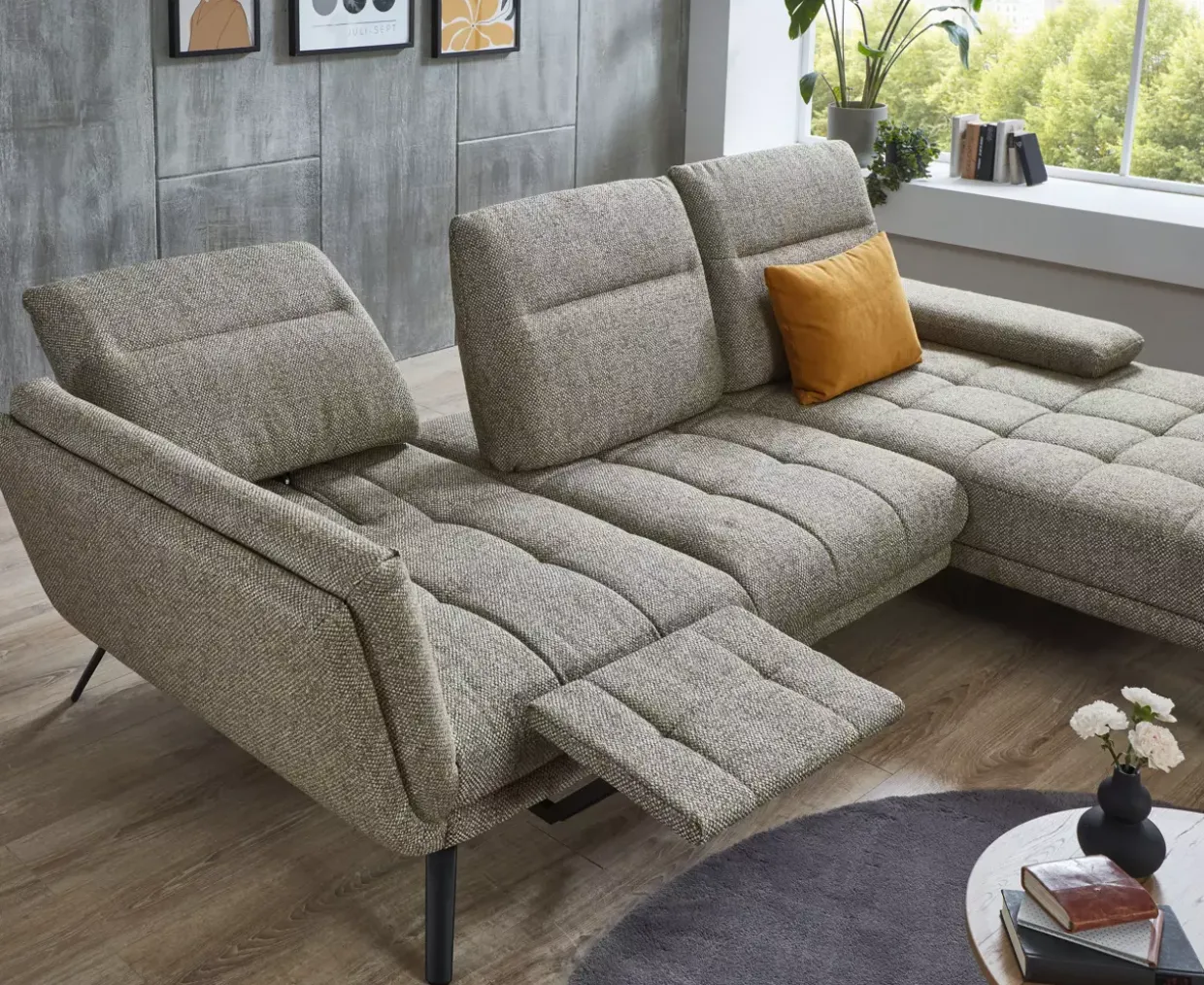 Besonders hervorzuheben ist die motorische Fußauflage für das einseitige Sofa, die für erholsame Momente sorgt. Die klappbare Armlehne auf der rechten Seite bietet Flexibilität und zusätzlichen Komfort. Dank der Schwenkrückenfunktion und der verstellbaren Rückenneigung mit Kopfteilverstellung ist die komplette Garnitur anpassbar und sorgt für ein optimales Sitzerlebnis.