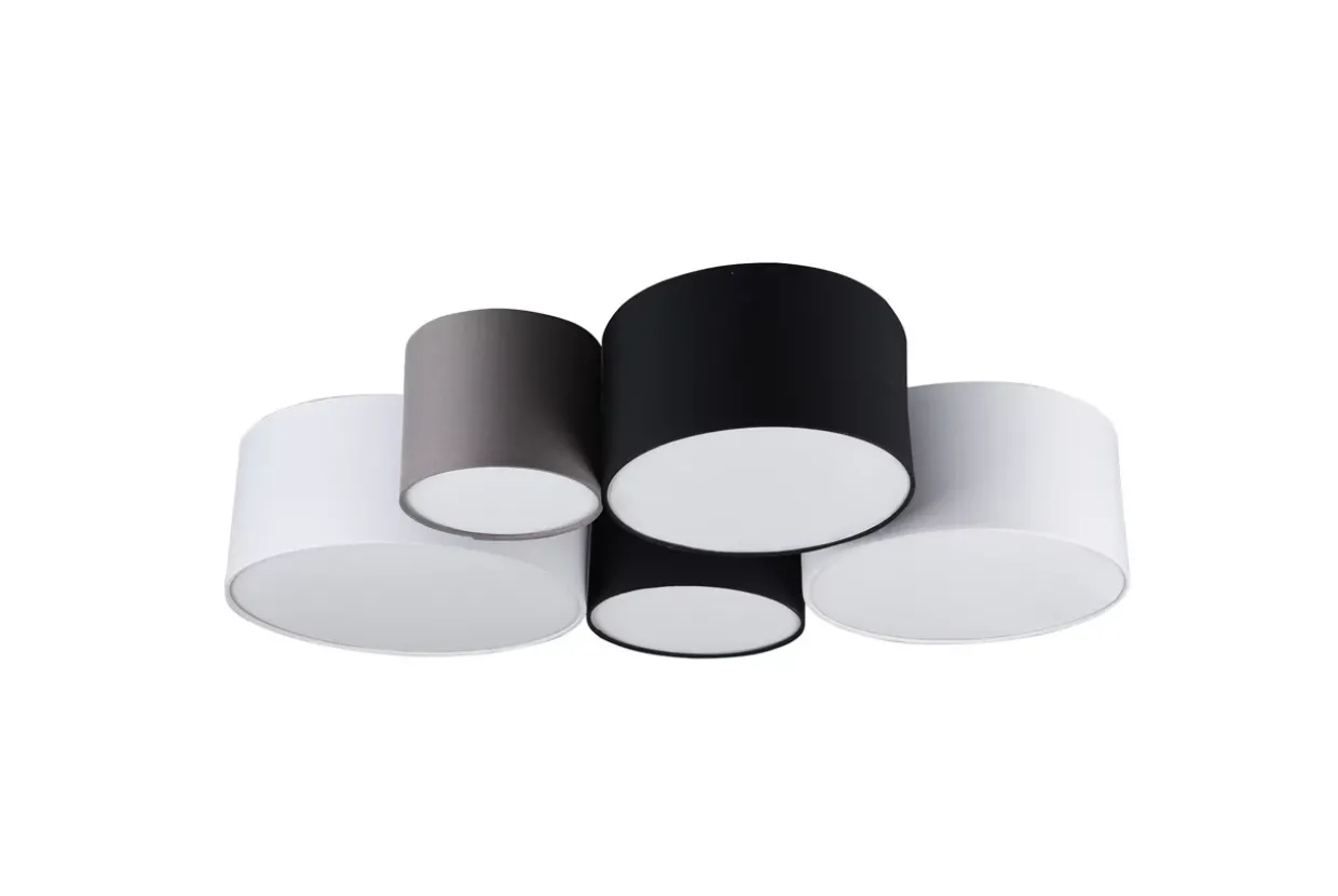 Stoffleuchten sorgen für eine gemütliche Atmosphäre und gelten als Klassiker der dekorativen Beleuchtung. Besonders im Wohn- und Schlafbereich kommt die fünfflammige Deckenleuchte gut zur Geltung. Sie spendet harmonische Lichtakzente und verleiht Ihrem Zuhause ein angenehmes Wohnklima. Zwei weiße, zwei schwarze und ein grauer Stoffschirm ergeben zusammen eine harmonische Kombination, die vielfältig verwendet werden kann. Für eine energiesparende Beleuchtung empfiehlt sich die Verwendung eines LED Leuchtmittels. Diese sind eine optimale Alternative zu herkömmlichen Halogen Leuchtmitteln und stehen für eine hohe Lichtqualität und eine Energieeinsparung von bis zu 80%. Zusätzlich profitieren Sie bei LED Leuchtmitteln von einer langen Lebensdauer, einer geringen Wärmeentwicklung und schonen gleichzeitig die Umwelt.