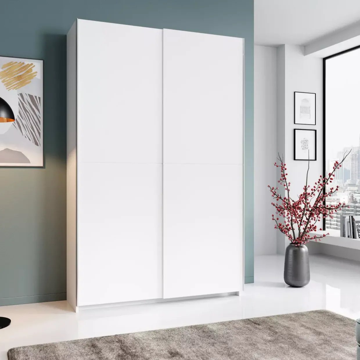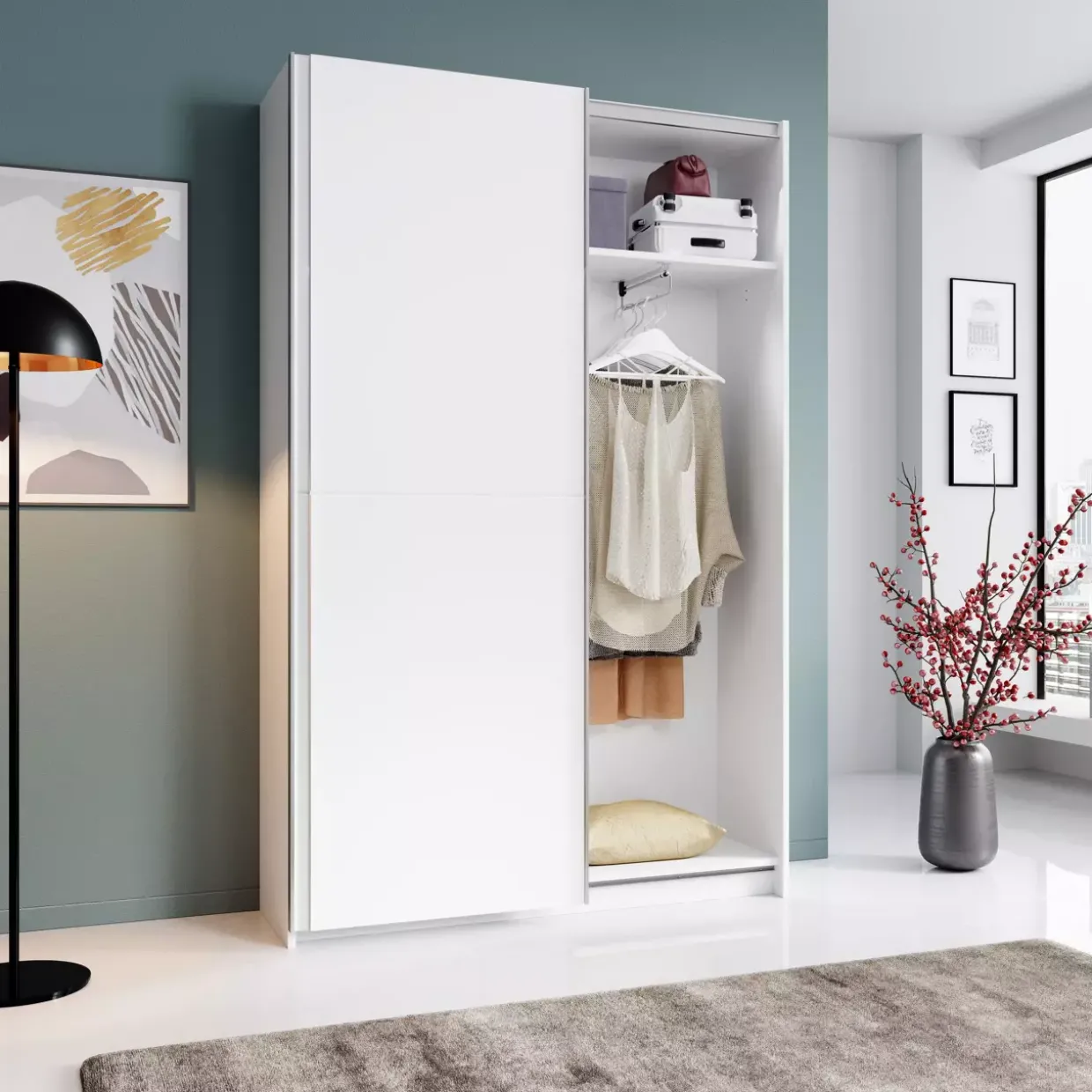 Ein Schwebetürenschrank ist besonders praktisch, wenn der Platz begrenzt ist, da die Türen nicht nach außen aufschwingen. Dies ermöglicht eine effiziente Raumnutzung und verleiht dem Raum eine aufgeräumte Optik. Die glatte Oberfläche der Türen lässt sich leicht reinigen und pflegen, was den Alltag erleichtert.