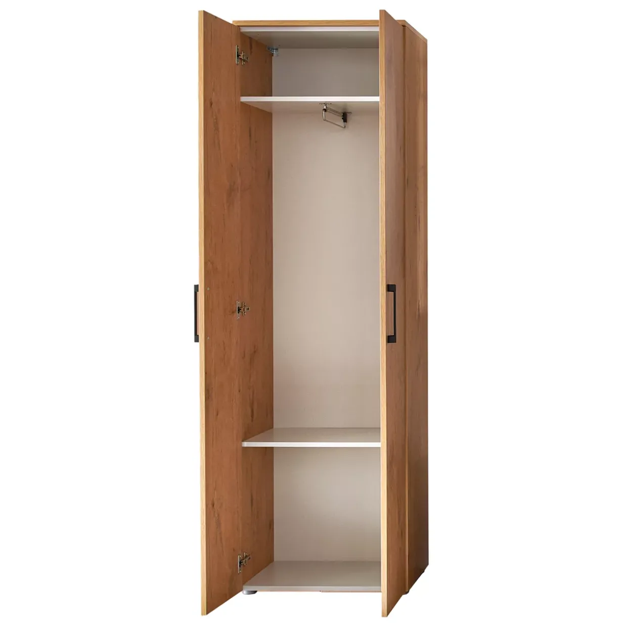 Der Dielenschrank ist mit zwei praktischen Drehtüren ausgestattet, die durch Türdämpfer sanft und geräuscharm schließen. Dies sorgt nicht nur für zusätzlichen Komfort, sondern auch für Langlebigkeit des Möbelstücks. Die Kombination aus Holzwerkstoff und Metall verleiht dem Schrank Stabilität und einen modernen Look.