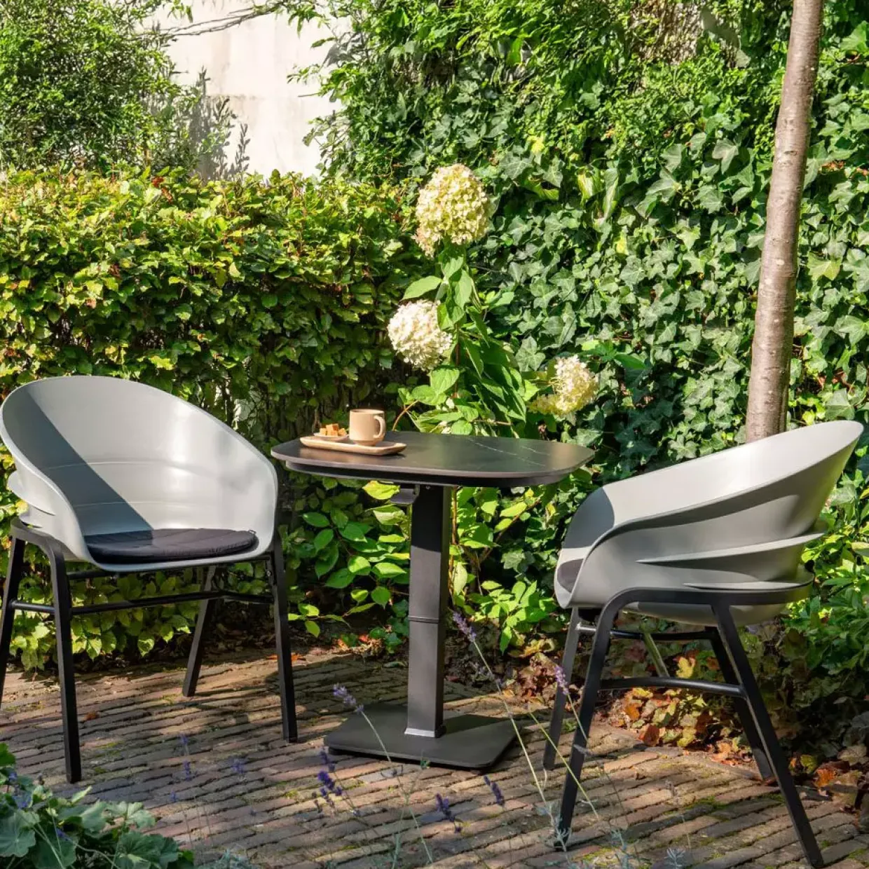 Die Kombination aus robustem Kunststoff und hochwertigem Aluminium garantiert eine langlebige und pflegeleichte Nutzung. Hervorzuheben ist das integrierte Wasserablaufsystem, das für eine einfache Pflege und Wartung sorgt. Höhenverstellbar von 72 bis 84 cm, lässt sich der Stuhl flexibel anpassen und bietet somit eine ideale Sitzposition für unterschiedliche Bedürfnisse.