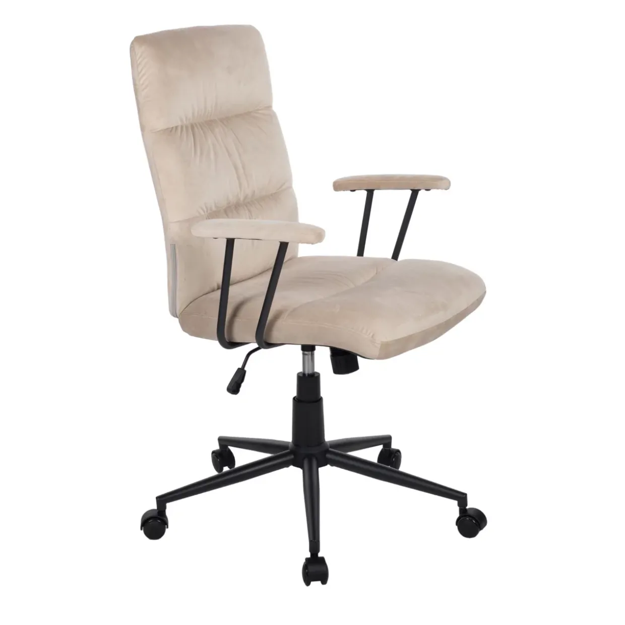Der Drehstuhl Fina vereint elegantes Design und herausragenden Komfort, was ihn zur idealen Wahl für moderne Büroumgebungen und stilvolle Homeoffices macht. Sein robustes Fußkreuz aus schwarzem Metall sorgt nicht nur für Stabilität, sondern auch für eine zeitgemäße Ästhetik. Die Sicherheitsdoppelrollen gewährleisten eine mühelose und sichere Beweglichkeit auf verschiedenen Bodenbelägen, was den Stuhl besonders praktisch und vielseitig einsetzbar macht. Der sandfarbene Veloursbezug verleiht dem Fina Drehstuhl eine luxuriöse und einladende Optik. Velours ist bekannt für seine weiche, samtartige Oberfläche, die ein angenehmes Sitzgefühl bietet und dem Stuhl eine edle Anmutung verleiht. Der warme Sandton des Bezugs harmoniert hervorragend mit dem schwarzen Metallgestell und bringt einen Hauch von Raffinesse in jeden Raum. Ein besonderes Highlight des Fina Drehstuhls ist die integrierte Wippmechanik mit Härtegradeinstellung. Diese Funktion ermöglicht es, die Neigung des Stuhls individuell anzupassen, was den Sitzkomfort erheblich erhöht, besonders bei längerem Sitzen. Die Härtegradeinstellung erlaubt es, den Widerstand der Wippmechanik nach persönlichen Vorlieben zu regulieren, wodurch der Stuhl sowohl flexibel als auch ergonomisch ist. Zusätzlich verfügt der Fina Drehstuhl über eine stufenlose Sitzhöhenverstellung, die eine exakte Anpassung der Sitzhöhe an die individuellen Bedürfnisse ermöglicht. Diese Funktion fördert eine ergonomische Sitzhaltung und kann Rückenbeschwerden vorbeugen, indem sie eine optimale Sitzposition gewährleistet. Die einfache Handhabung der Höhenverstellung macht den Stuhl besonders benutzerfreundlich.