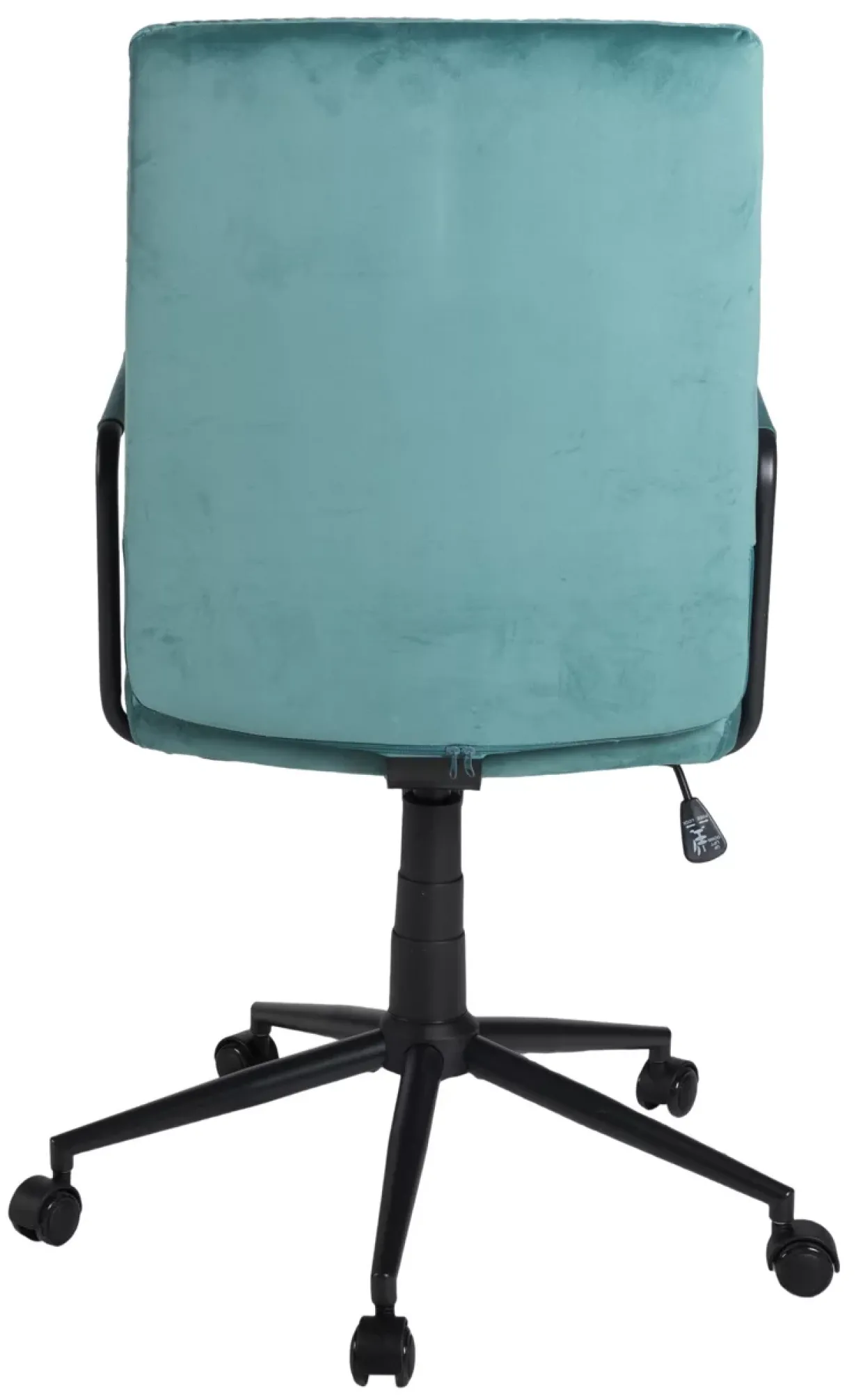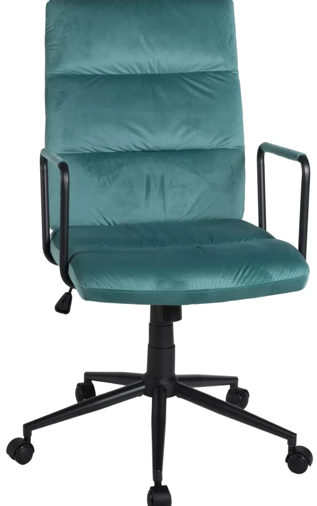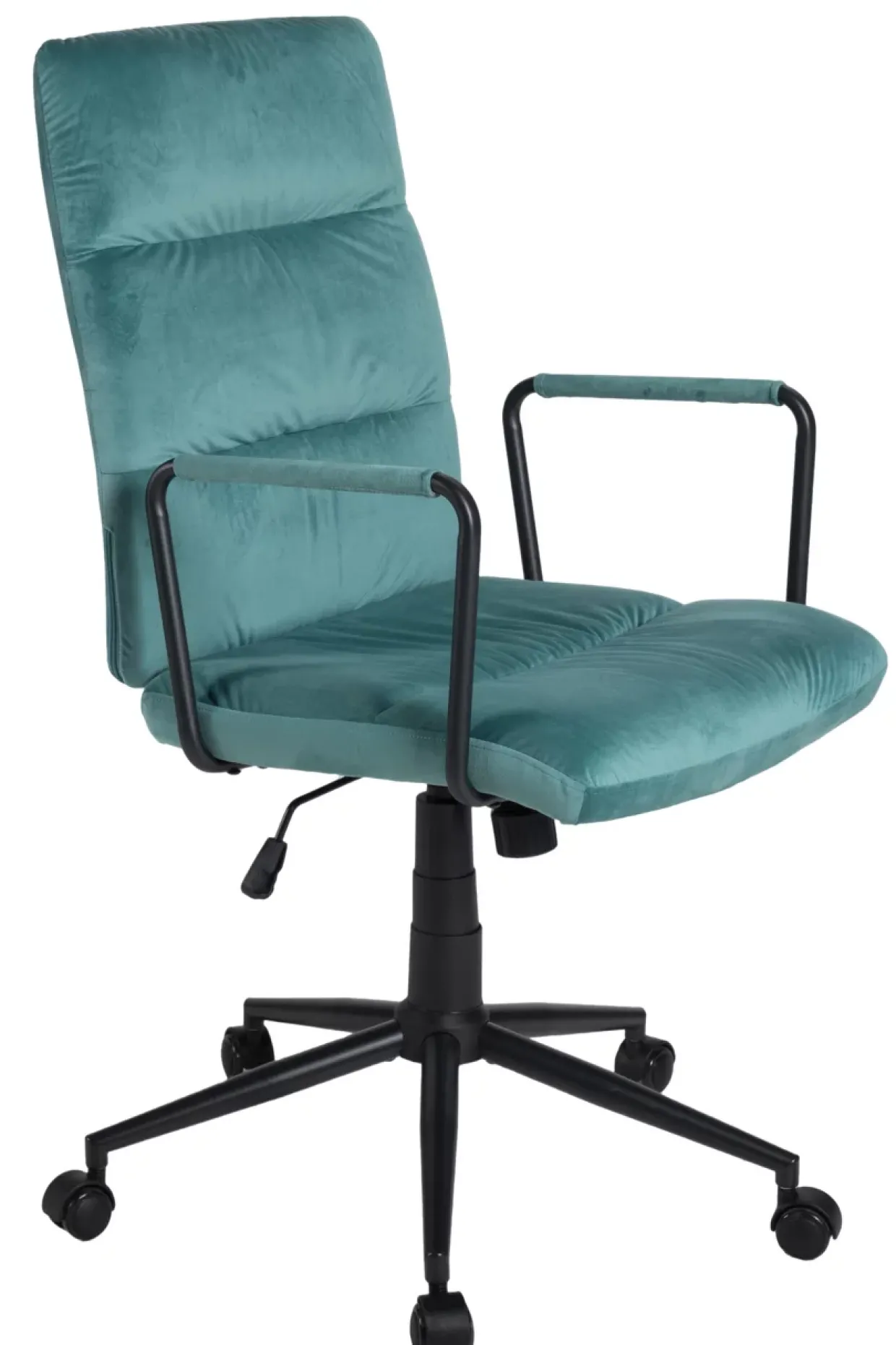 Ein Drehstuhl in Petrol mit Veloursbezug und einem schwarzen Metallfußkreuz vereint modernes Design mit einem Hauch von Luxus. Die Farbe Petrol, ein elegantes Mischung aus Blau und Grün, verleiht dem Stuhl eine ansprechende und zeitgemäße Ästhetik.