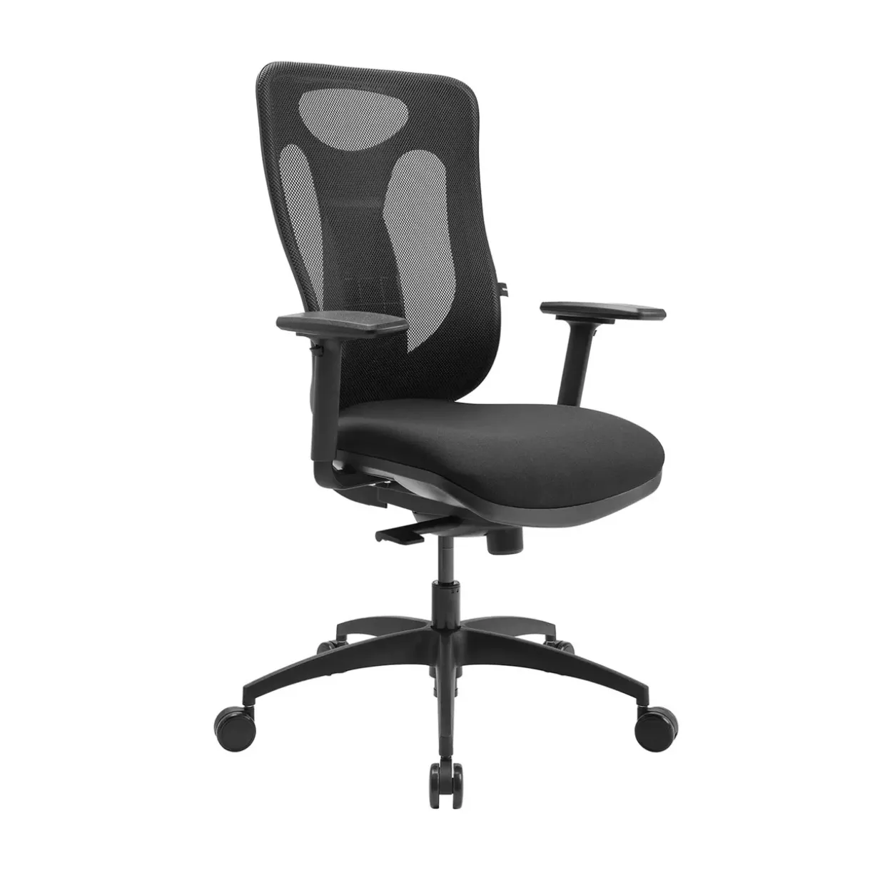 Inklusion der höhenverstellbaren Armlehnen mit Softpadauflage sorgt für besonderen Komfort und Anpassungsfähigkeit. Der moderne Drehstuhl, aus hochwertigem Stoff gefertigt und in elegantem Schwarz gehalten, fügt sich nahtlos in jedes zeitgemäße Arbeitsumfeld ein. Die Rückenlehne, mit atmungsaktivem Netzbezug ausgestattet, bietet nicht nur angenehme Belüftung, sondern lässt sich auch in der Höhe verstellen, um optimalen Halt zu gewährleisten.