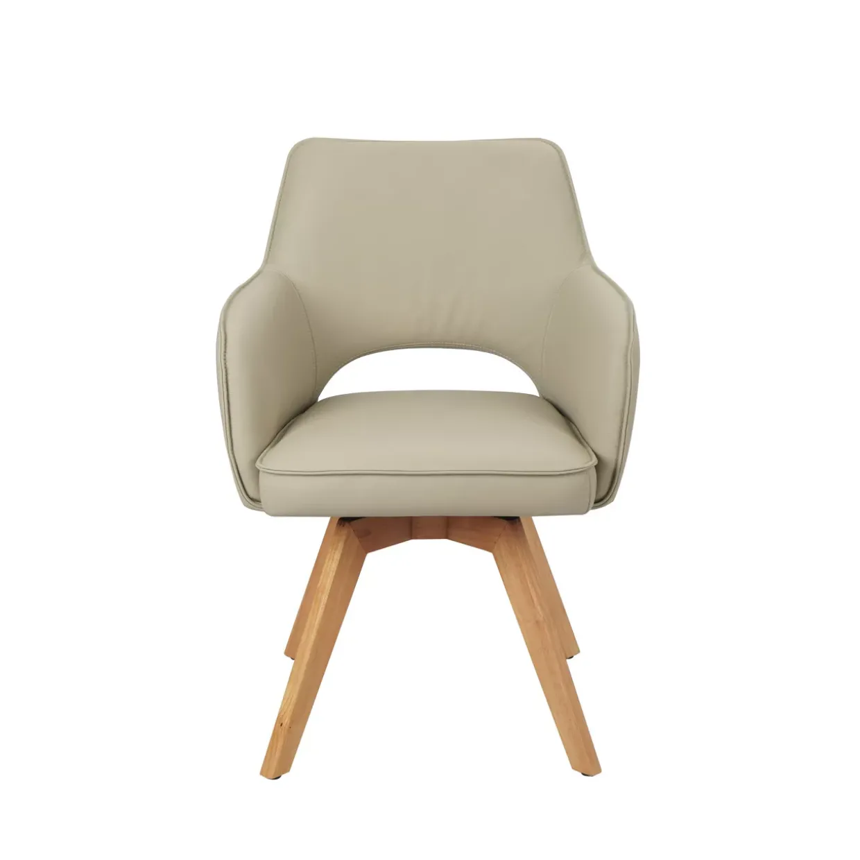 Mit einer automatischen Rückstellung ausgestattet, bietet der Tailfingen Drehstuhl ein Höchstmaß an Komfort und Bequemlichkeit. Die Verschmelzung von Leder und Holz verkörpert den eleganten Japandi-Stil, der Einfachheit und Funktionalität in den Vordergrund stellt. Der warme Beige-Ton fügt sich harmonisch in jede Umgebung ein und schafft eine beruhigende Atmosphäre.