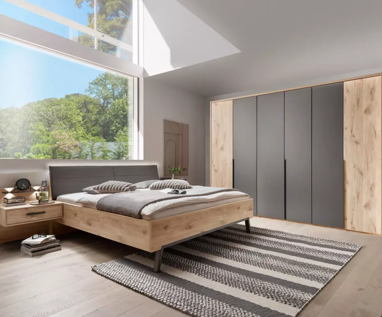 Der Innenraum des Schrankes überzeugt durch durchdachte Ausstattung. Jeder Fachbereich ist mit zwei Einlegeböden und einer Kleiderstange versehen, die eine flexible und organisierte Aufbewahrung Ihrer Garderobe ermöglichen. Griffe in einem ansprechenden Schieferfarbton ergänzen das Design und fügen sich nahtlos in das Gesamtkonzept ein.