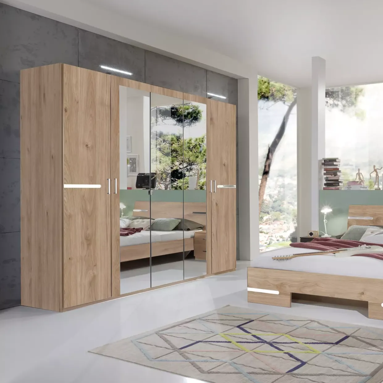 Drehtürenschrank Anna beeindruckt mit seinem modernen Stil und einer eleganten Kombination aus Artisan Eiche Nachbildung und glänzenden Chrom-Applikationen. Diese gelungene Materialwahl verleiht jedem Raum eine zeitlose Eleganz. Besonders hervorzuheben sind die drei integrierten Spiegel, die nicht nur optisch vergrößern, sondern auch den Raum mit zusätzlichem Licht durchfluten.