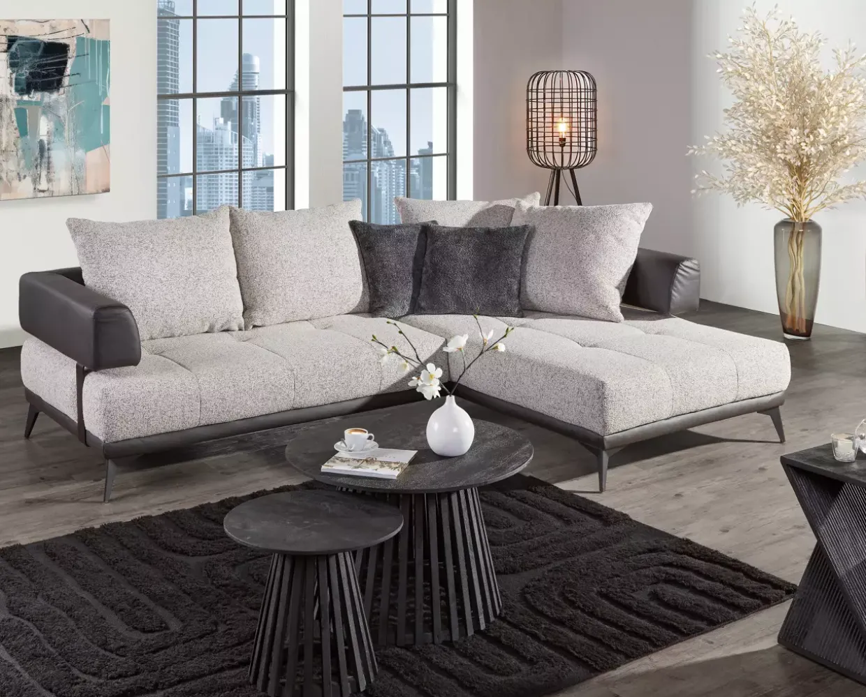 Ein Ecksofa, das nicht nur durch seine ästhetische Gestaltung überzeugt, sondern auch durch seine funktionalen Eigenschaften. Die großzügige Ottomane lädt zum entspannten Verweilen ein und bietet zusätzlichen Platz für Gäste. Ob als zentrales Element im Wohnzimmer oder als gemütlicher Rückzugsort, dieses Möbelstück passt sich Ihren Bedürfnissen an und bereichert Ihr Zuhause mit einem Hauch von Modernität und Klasse. Ein Ecksofa, das durch Qualität und Design besticht, und gleichzeitig ein Ort der Entspannung und Geselligkeit ist.
