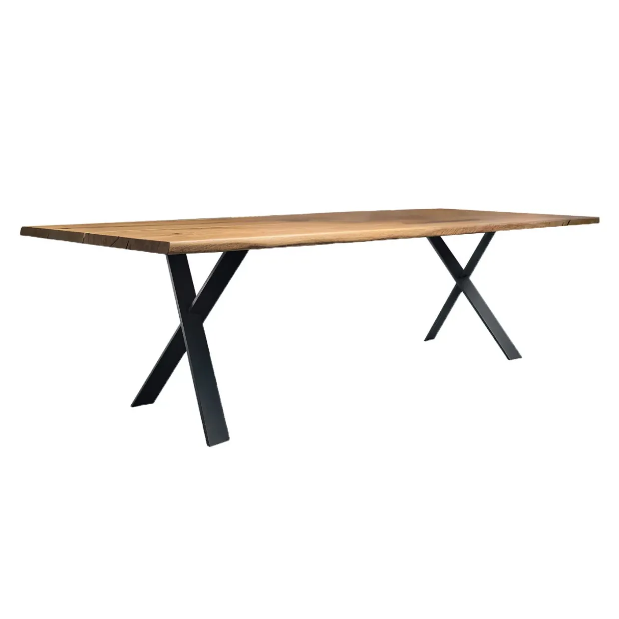 Das Zusammenspiel von Metall und Holz verleiht diesem Möbelstück eine zeitlose Ästhetik. Der Kreuzfuß sorgt nicht nur für Stabilität, sondern setzt auch einen markanten Akzent im Design. Die einzigartige Kombination aus Rissen, Ästen, Spalten und Löchern, die sorgfältig versiegelt sind, verleiht dem Tisch Charakter und Charme.
