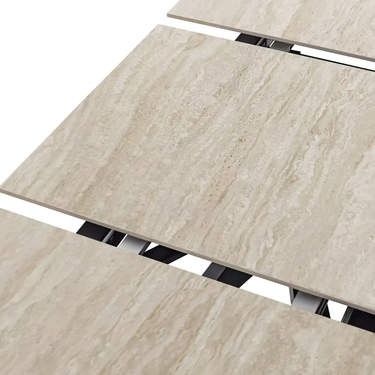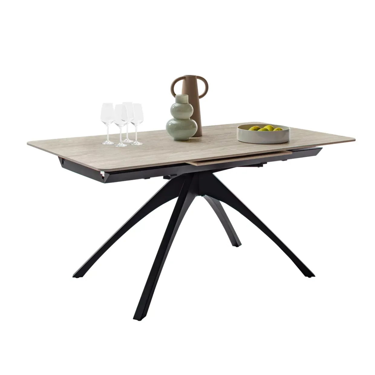 Ein Synchronauszug, der beeindruckt. Der Cerrito Auszugstisch vereint modernes Design mit funktionaler Raffinesse. Seine zeitgenössische Ästhetik wird durch die harmonische Kombination aus warmen Beigetönen und elegantem Schwarz unterstrichen. Metall und Holzwerkstoff verschmelzen zu einem robusten und gleichzeitig stilvollen Möbelstück, das in jedem Raum zum Blickfang wird. Die praktischen Details lassen keine Wünsche offen: Eine Einlegeplatte mit cleverer Liftfunktion ermöglicht eine flexible Anpassung an unterschiedliche Anlässe und Platzbedürfnisse. Ein Höchstmaß an Komfort und Benutzerfreundlichkeit steht im Vordergrund, wenn es darum geht, den Tisch Ihren Bedürfnissen anzupassen. Die klare Linienführung und die hochwertigen Materialien verleihen dem Auszugstisch nicht nur eine moderne Optik, sondern auch eine lange Lebensdauer. Ein Möbelstück, das sowohl in großen als auch in kleinen Räumen seine Wirkung entfaltet und eine Atmosphäre von Eleganz und Funktionalität schafft. Der Cerrito Auszugstisch ist die ideale Wahl für diejenigen, die Wert auf Design und Praktikabilität legen. Mit diesem Tisch wird jedes Treffen zu einem stilvollen Ereignis, bei dem sich Funktionalität und Ästhetik die Hand reichen.