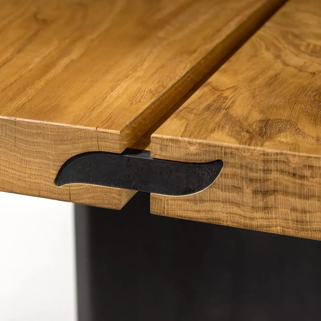 Ein praktisches Highlight dieses Esstisches ist der integrierte Topfuntersetzer. Diese nützliche Ergänzung schützt die Tischoberfläche und ermöglicht es Ihnen, heiße Töpfe und Pfannen direkt auf dem Tisch abzustellen, ohne das Holz zu beschädigen.