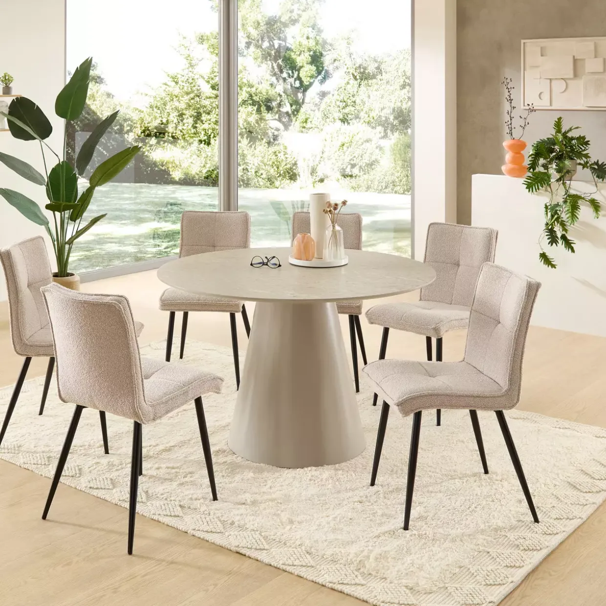 Ein bemerkenswertes Designmerkmal des Garret Esstisches ist seine runde Form, die ihm eine zeitlose Eleganz verleiht. Die Tischplatte, mit einem großzügigen Durchmesser von 120 cm, bietet ausreichend Platz für gesellige Zusammenkünfte oder gemütliche Dinner-Abende. Dank der melaminharzbeschichteten Oberfläche ist der Tisch besonders pflegeleicht und widerstandsfähig, was ihn zu einer praktischen Wahl für den Alltag macht.