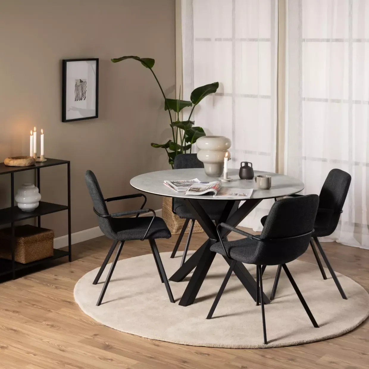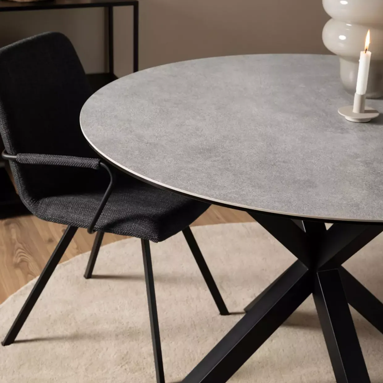 Ein moderner Esstisch kann das Herzstück Ihres Wohnbereichs sein. Das Modell Heaven überzeugt durch seine runde Form, die ein harmonisches Ambiente in Ihrem Esszimmer schafft. Die Kombination aus schwarzem, mattiertem Metall und Anista grau rauer Keramik verleiht dem Tisch eine zeitlose Eleganz, die sich nahtlos in verschiedene Einrichtungsstile einfügt.