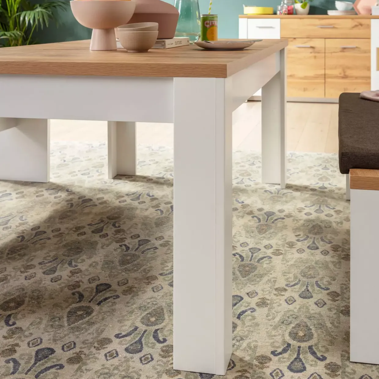 Der Matera Esstisch im stilvollen Cottage-Design bringt natürliche Eleganz in Ihr Zuhause. Mit seiner harmonischen Farbgebung in Weiß und Braun sowie den warmen Eiche-Holztönen fügt er sich nahtlos in jedes Ambiente ein. Der Tisch überzeugt nicht nur durch sein zeitloses Design, sondern auch durch seine Funktionalität. Gefertigt aus hochwertigem Holzwerkstoff, ist der Matera Esstisch robust und langlebig, wodurch er Ihnen über viele Jahre hinweg Freude bereiten wird. Seine großzügige Tischplatte bietet ausreichend Platz für gemütliche Abendessen mit der Familie oder gesellige Runden mit Freunden.