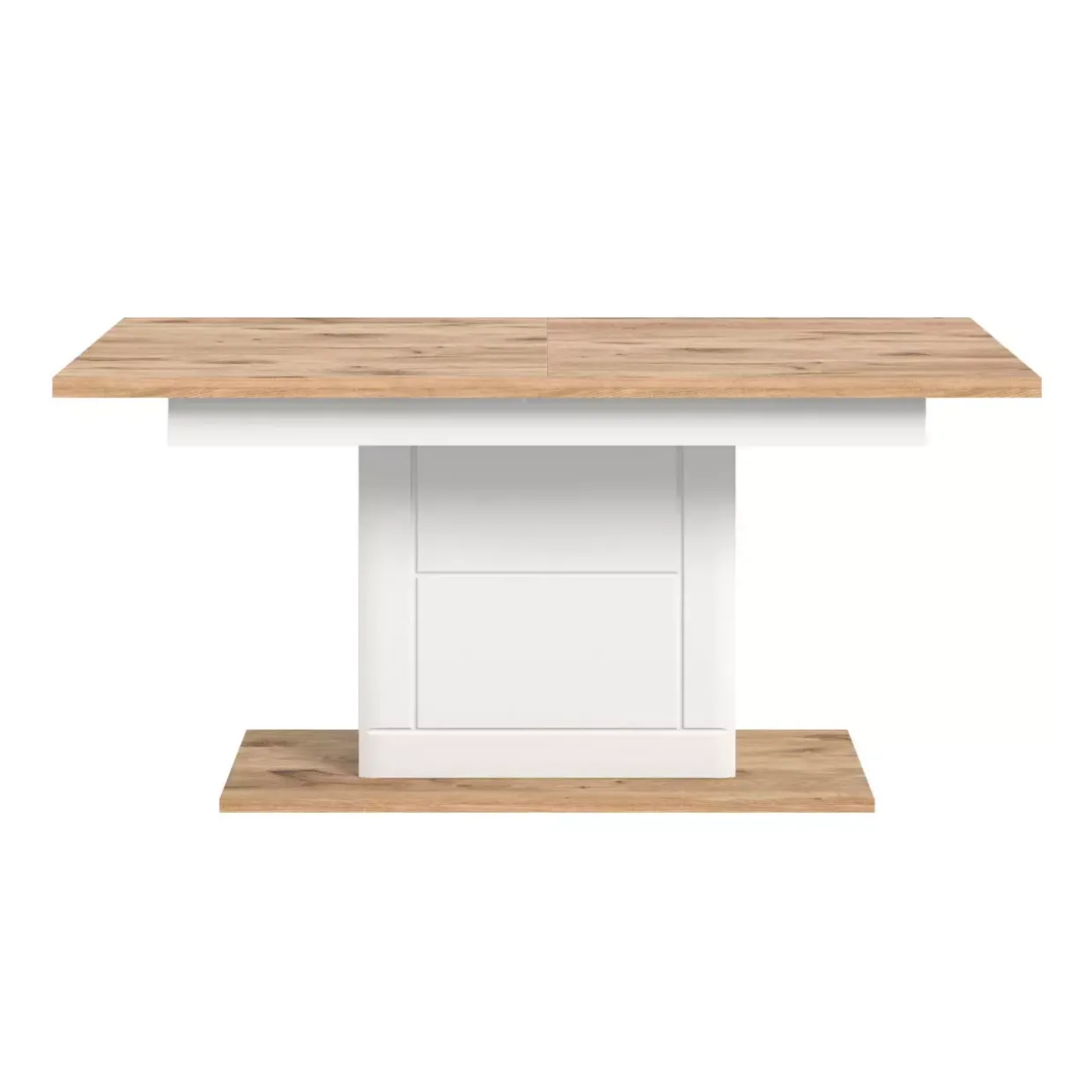 Der ausziehbare Esstisch besticht nicht nur durch seine optischen Merkmale, sondern auch durch seine funktionalen Vorteile. Dank der Säulenfußform bietet er eine stabile Basis, die gleichzeitig ausreichend Beinfreiheit gewährleistet. Gefertigt aus hochwertigem Holzwerkstoff, garantiert dieser Tisch eine langlebige und robuste Nutzung, die Sie bei jedem Familienessen oder geselligen Beisammensein überzeugen wird. Der Ausziehmechanismus ermöglicht es Ihnen, den Tisch im Handumdrehen zu vergrößern, sodass Sie stets flexibel auf spontane Gäste oder besondere Anlässe vorbereitet sind.