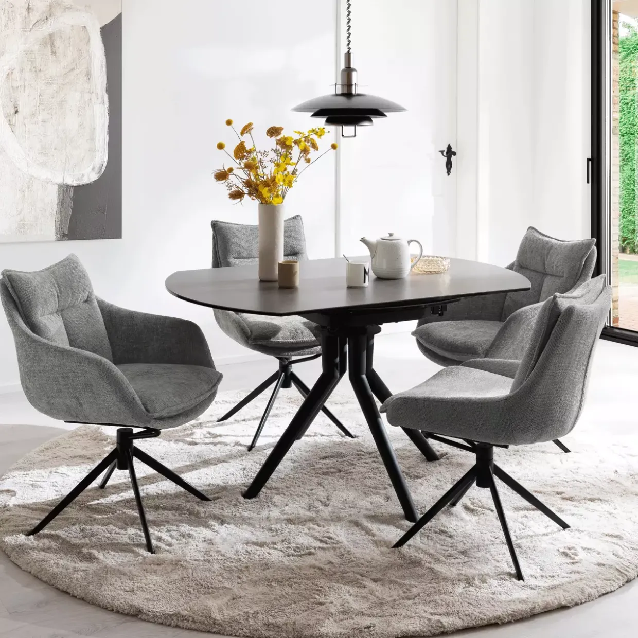 RUBIKON Auszugtisch 90 (135) cmEin moderner Esstisch, der mit seiner schlichten Eleganz überzeugt, kann das Herzstück eines jeden Esszimmers sein. Die Kombination aus Glas und Metall verleiht diesem Tisch eine zeitlose Ästhetik, die sowohl robust als auch stilvoll wirkt. Besonders hervorzuheben ist das durchdachte 4-Fußgestell, das nicht nur Stabilität, sondern auch eine klare Linienführung bietet.Schwarz und Anthrazit setzen edle Akzente und lassen sich mühelos in verschiedenste Einrichtungsstile integrieren. Die harmonische Farbkombination verleiht dem Raum eine ruhige und zugleich ansprechende Atmosphäre. Ein besonderes Highlight ist der Längsseitenauszug, der bei Bedarf zusätzlichen Platz schafft und flexibel auf unterschiedliche Anlässe reagiert. Ob für ein gemütliches Abendessen im kleinen Kreis oder eine größere Feier – dieser Tisch passt sich Ihren Bedürfnissen an.Die hochwertige Verarbeitung der Materialien verspricht Langlebigkeit und eine pflegeleichte Handhabung. Das Zusammenspiel von Glas und Metall schafft nicht nur eine moderne Optik, sondern sorgt auch für eine stabile Konstruktion. Dieser Auszugtisch ist nicht nur ein praktisches Möbelstück, sondern auch ein Ausdruck von Stil und Funktionalität. Freuen Sie sich auf gemütliche Stunden und unvergessliche Momente im Kreise Ihrer Liebsten.