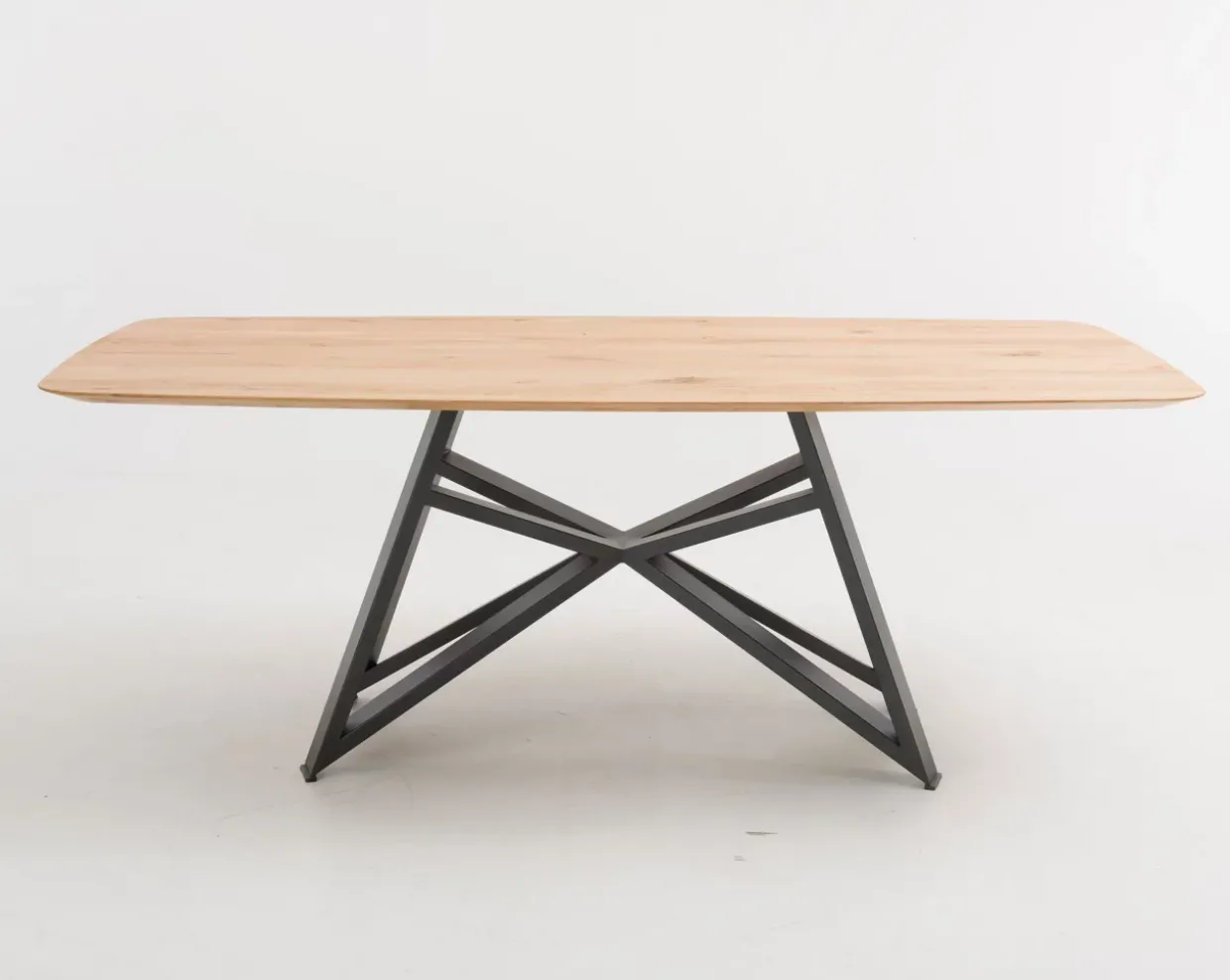 Anthrazitfarbene Eleganz trifft auf naturbelassene Eiche. In einer modernen Einrichtung darf ein stilvoller Esstisch nicht fehlen. Der Sage Holz Esstisch vereint die kühle Ästhetik von Metall mit der warmen Ausstrahlung von Holz. Diese harmonische Kombination passt sich ideal in ein modernes Wohnambiente ein.