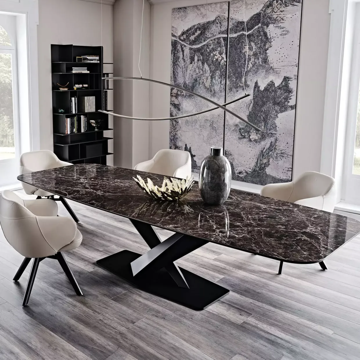 Ein Hauch von Moderne: Der Stratos Esstisch beeindruckt durch seinen zeitgenössischen Stil, der sich nahtlos in jedes moderne Ambiente einfügt. Mit einer eleganten Kombination aus Metall und Keramik schafft er eine Atmosphäre, die sowohl stilvoll als auch funktional ist. Die Tischplatte aus hochwertiger Keramik bietet nicht nur eine ansprechende Optik, sondern ist auch besonders pflegeleicht und langlebig.
