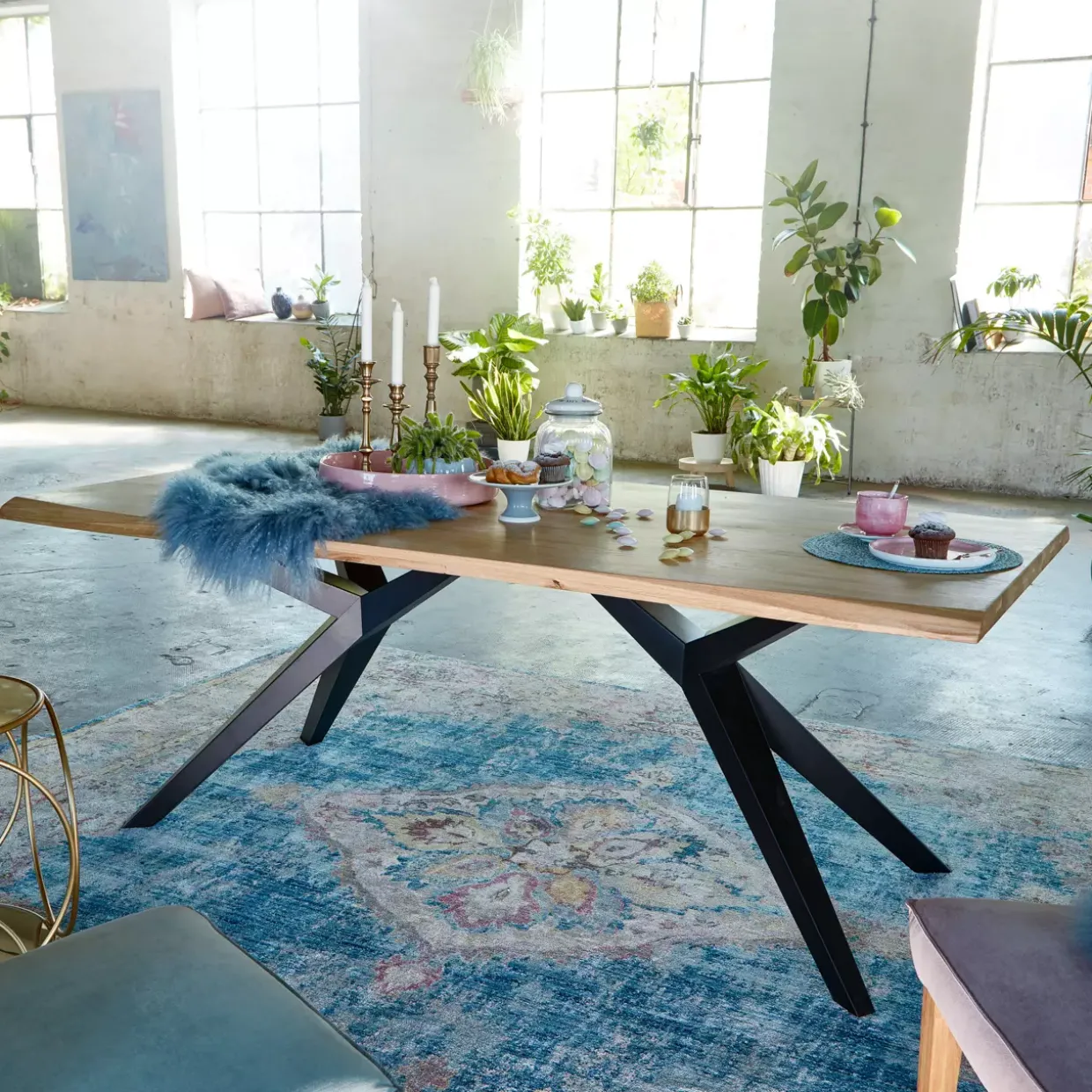 Die geölte Oberfläche des Tisches sorgt nicht nur für einen natürlichen Schutz des Materials, sondern hebt auch die natürliche Maserung des Holzes hervor. Dadurch entsteht ein harmonisches Zusammenspiel zwischen den verwendeten Materialien Metall und Holz. Diese Materialkombination spiegelt die perfekte Symbiose aus Stabilität und ästhetischem Anspruch wider.