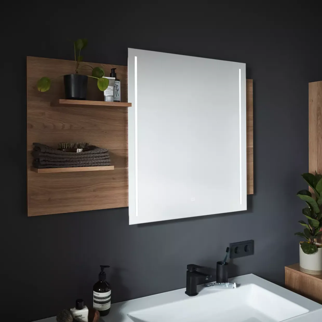 Praktische Ablagefächer auf der linken Seite des Flächenspiegels bieten Platz für Pflegeprodukte und Dekorationselemente. Sie haben somit alles Notwendige stets griffbereit und können den Raum um den Spiegel herum frei gestalten. Der moderne Stil passt sich mühelos verschiedenen Einrichtungsstilen an und fügt sich harmonisch in Ihr Zuhause ein.
