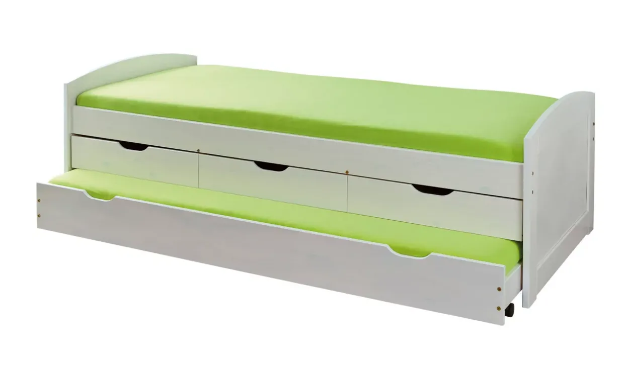 Drei geräumige Schubladen bieten zusätzlichen Stauraum und tragen zur Ordnung bei. Der integrierte Lattenrost sorgt für optimalen Schlafkomfort, sowohl für die Hauptmatratze mit den Maßen 90×200 cm als auch für die ausziehbare Liege mit einer 90×190 cm Matratze. So wird aus einem Einzelbett im Handumdrehen ein komfortabler Schlafplatz für Gäste.