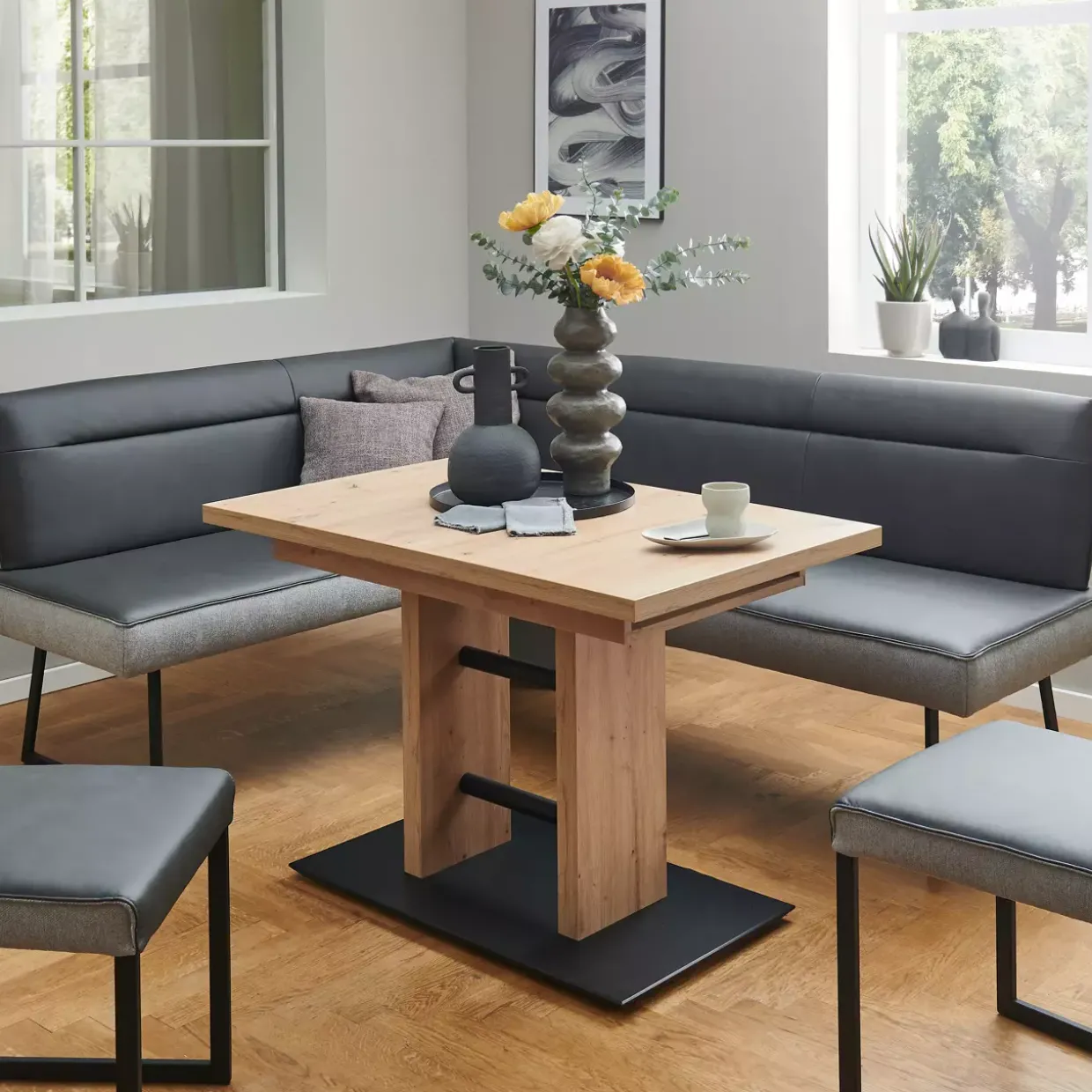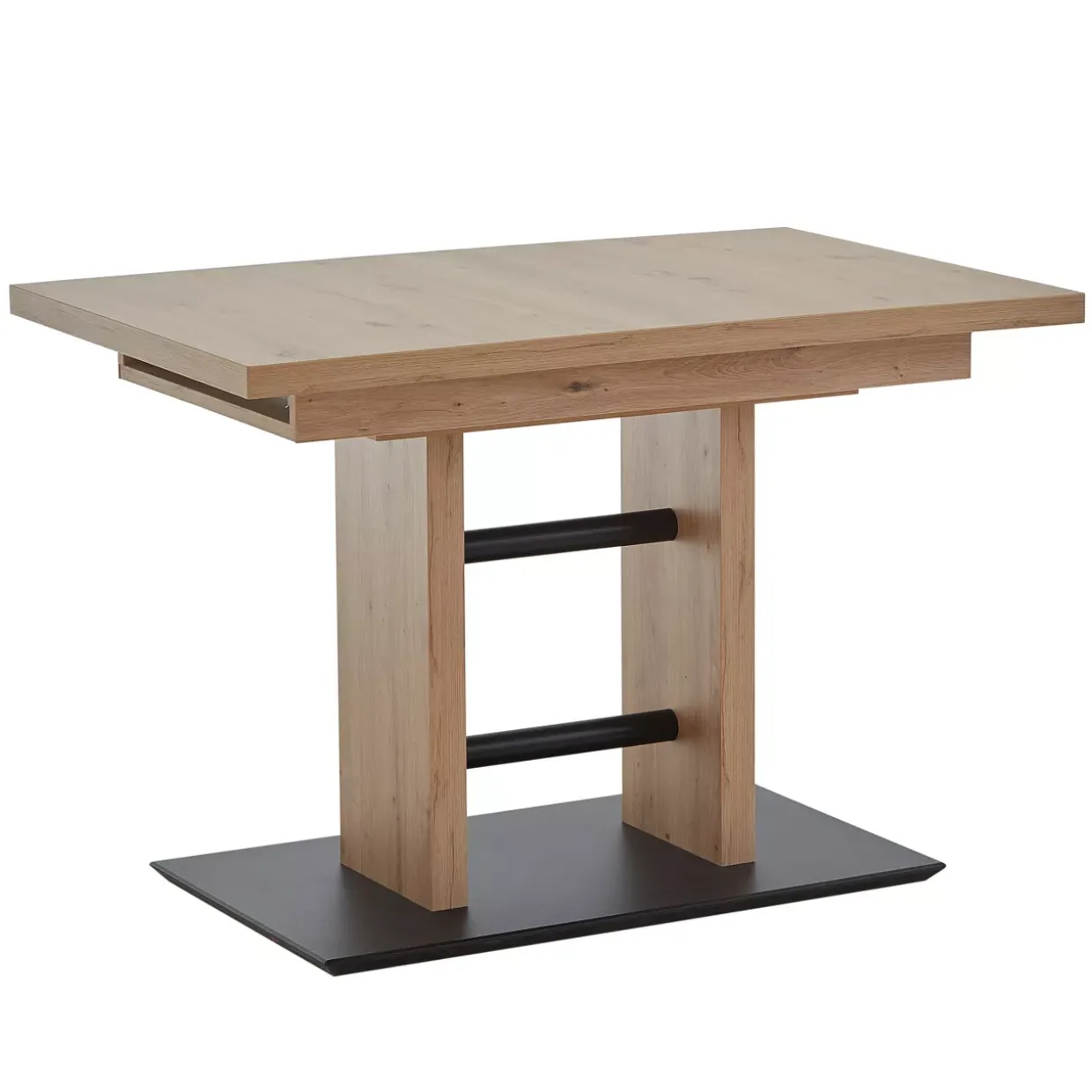Ein Highlight dieses modernen Möbelstücks ist die praktische Schiebe- Ansteckplatte, die Ihnen zusätzliche 40 cm Platz bietet. Die Kombination aus der Farbe der Rohre und Bodenplatte in elegantem Schwarz und der warmen Artisaneiche Nachbildung verleiht dem Tisch eine stilvolle und zeitgemäße Optik, die sich nahtlos in verschiedene Wohnkonzepte einfügt. Die Fußform als stabile Platte sorgt für festen Stand und unterstreicht das moderne Design.Gefertigt aus hochwertigem Holzwerkstoff, vereint dieses Möbelstück Langlebigkeit mit einer ansprechenden Ästhetik. Die Verarbeitung des Materials gewährleistet eine pflegeleichte Oberfläche, die sich im Alltag als äußerst praktisch erweist. Die moderne Form und die dezente Farbgebung machen den Tisch zu einem vielseitigen Begleiter in Ihrem Zuhause, sei es im Essbereich oder im Wohnzimmer.Der Funktions-Charakter des Möbelstücks bietet Ihnen Flexibilität im Alltag. Ob für gesellige Runden oder als Arbeitsplatz, die erweiterbare Tischfläche passt sich Ihren Bedürfnissen an. Das klare Design und die durchdachte Funktionalität machen diesen Tisch zu einem zeitlosen Begleiter, der Ihnen lange Freude bereiten wird. Entdecken Sie die Möglichkeiten, die dieses moderne Möbelstück für Ihre Wohnräume bietet.