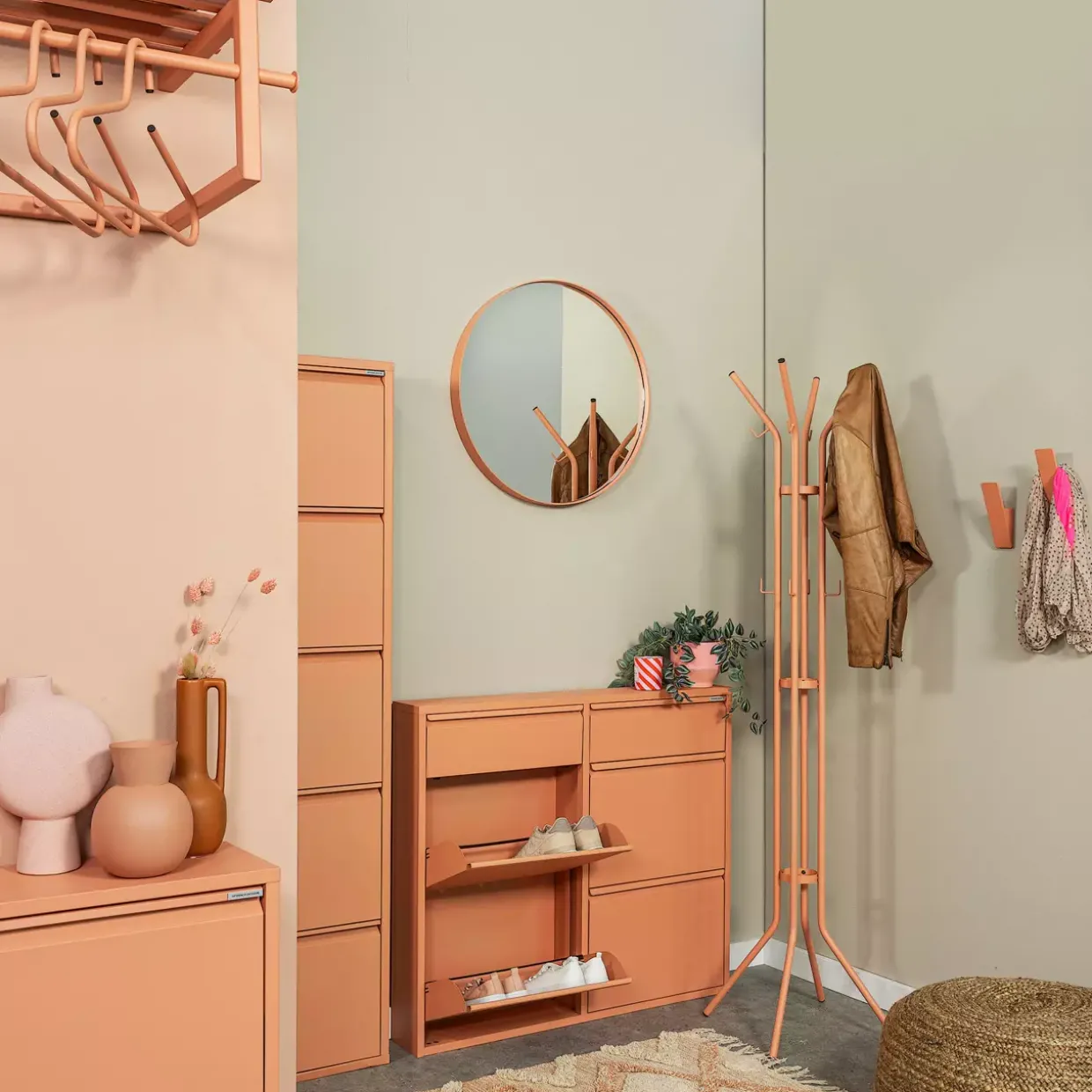 Durch ihr durchdachtes Design fügt sich die Garderobe nahtlos in verschiedenste Wohnkonzepte ein. Der moderne Stil dieser Garderobe harmoniert perfekt mit anderen zeitgemäßen Möbelstücken und Dekorelementen. Clay Terra, als Farbe, bietet eine vielseitige Basis, die mit verschiedenen Farbpaletten kombiniert werden kann.