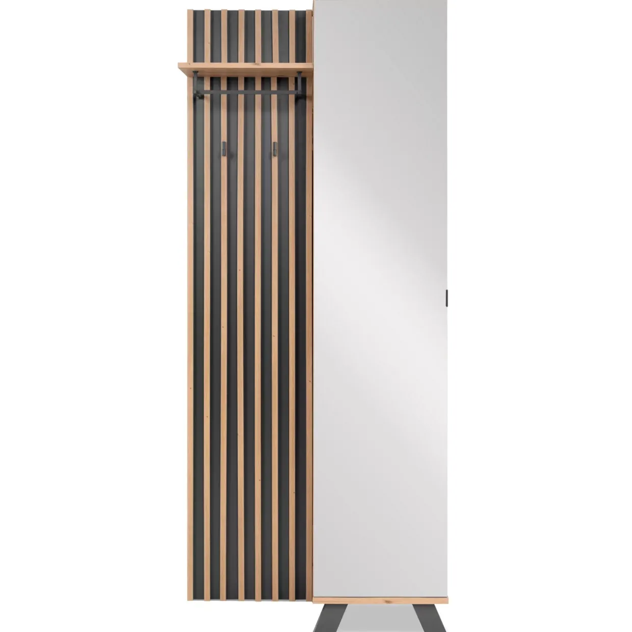 Besonderes Augenmerk verdienen die aufgesetzten Lamellen in Holzoptik, die dem Ensemble eine edle Note verleihen. Eine nützliche Hutablage ergänzt das Design und bietet zusätzlichen Stauraum für Ihre Accessoires. Die ABS-Kante in Artisan Eiche rundet das Gesamtbild harmonisch ab und sorgt für eine angenehme Haptik.