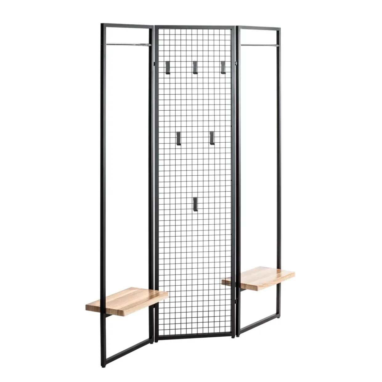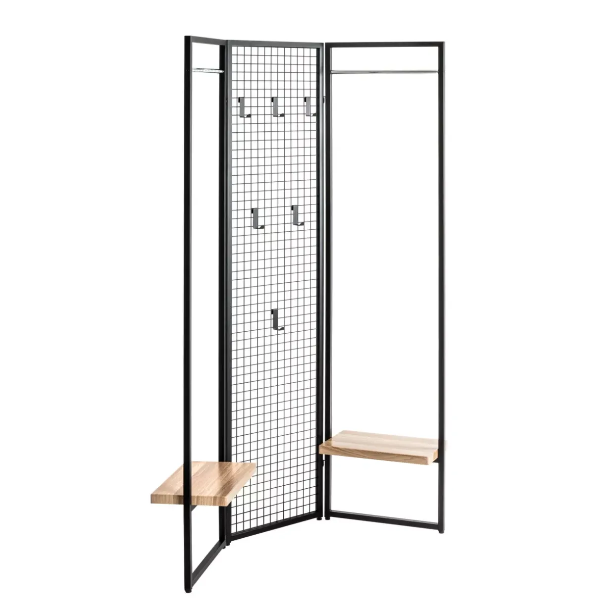 Harmonisch fügt sich das Zusammenspiel von schwarzen und eichefarbenen Elementen in verschiedene Wohnumgebungen ein. Dabei sorgt der Stahl, der für die Metallteile verwendet wird, nicht nur für eine solide Konstruktion, sondern auch für eine ansprechende Optik. Die Garderobe bietet genügend Raum, um Mäntel, Jacken und Accessoires stilvoll zu organisieren.