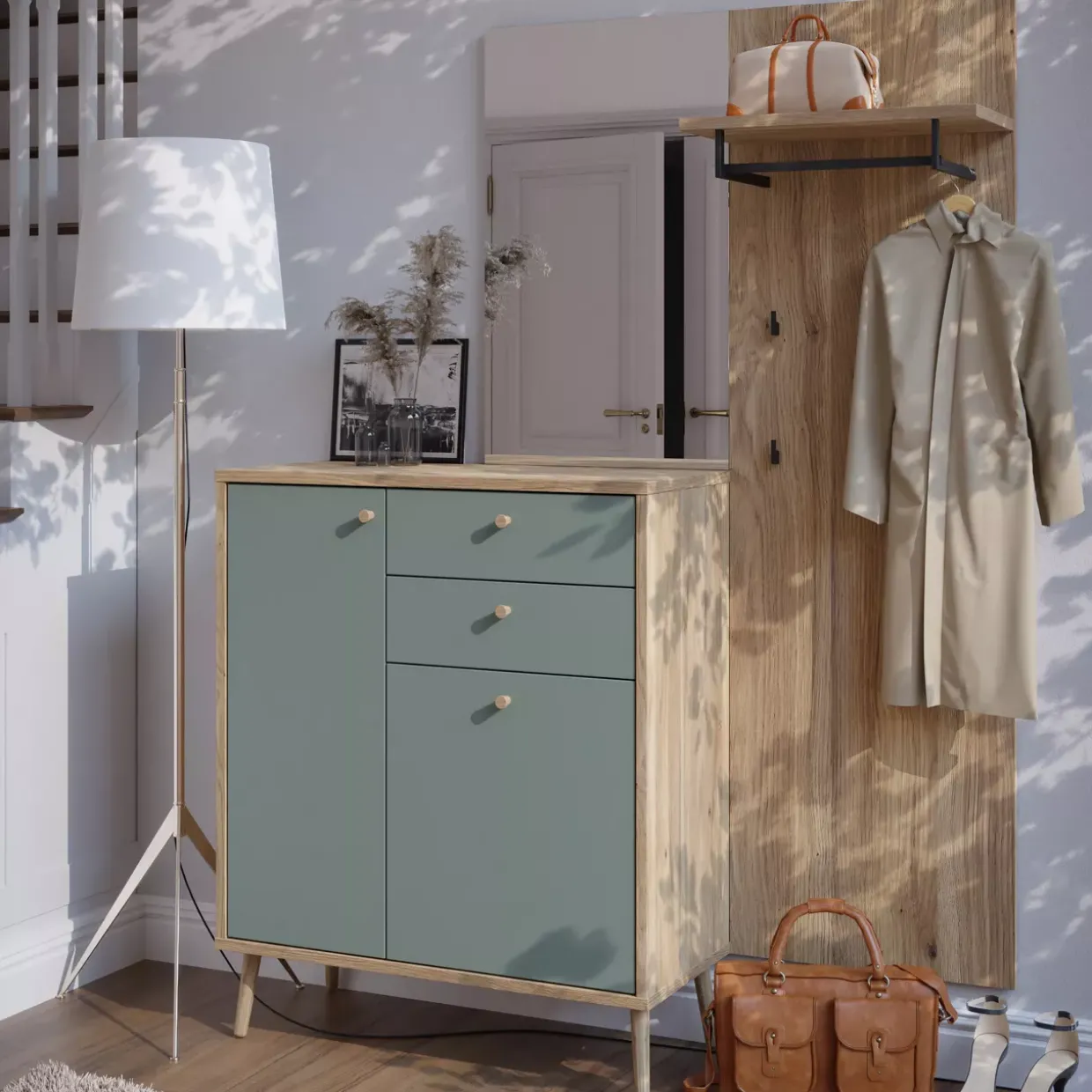 Massives Eichenholz, kombiniert mit hochwertigen Holzwerkstoffen und Glas, verleiht der Garderobe eine robuste und langlebige Struktur. Die unbehandelten Knöpfe setzen einen natürlichen Akzent und runden das Gesamtbild stilvoll ab. Das 4-Fußgestell bietet nicht nur Stabilität, sondern unterstreicht auch das moderne Design.