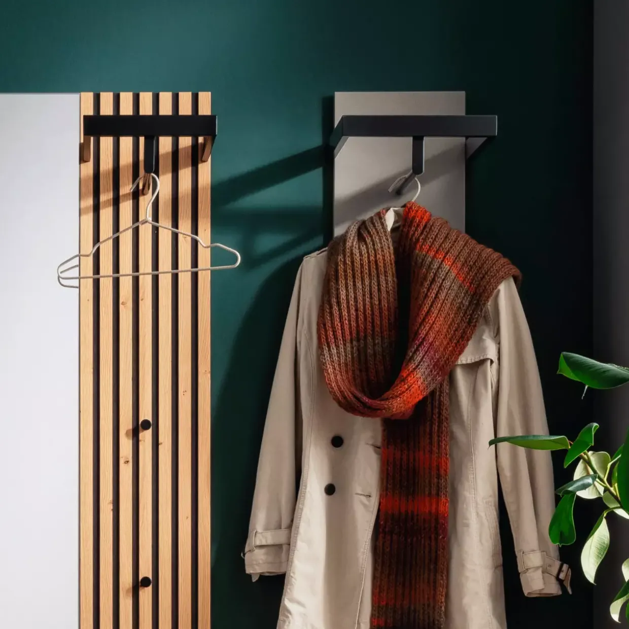 Die zwei Garderobenpaneele bieten ausreichend Platz, um Kleidungsstücke, Schals, Taschen und andere Accessoires ordentlich aufzuhängen. Mit Abmessungen von etwa 178x200x38 Zentimetern passt diese Garderobenkombination problemlos in viele verschiedene Eingangsbereiche und bietet dennoch ausreichend Stauraum und Sitzgelegenheit.