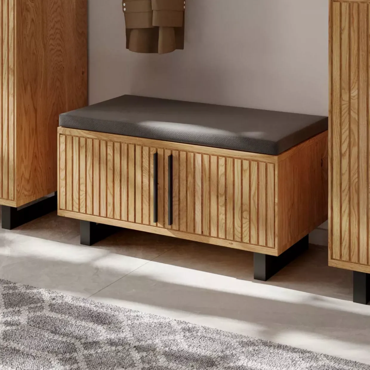 Die Oberfläche dieses Möbelstücks beeindruckt mit ihrem edlen, furnierten Finish. Die Garderobenbank, Modell Martha, vereint klassisches Design mit moderner Funktionalität. Gefertigt aus einer Kombination von Holz, Holzwerkstoff und Metall, bietet sie sowohl Stabilität als auch einen ansprechenden ästhetischen Reiz.