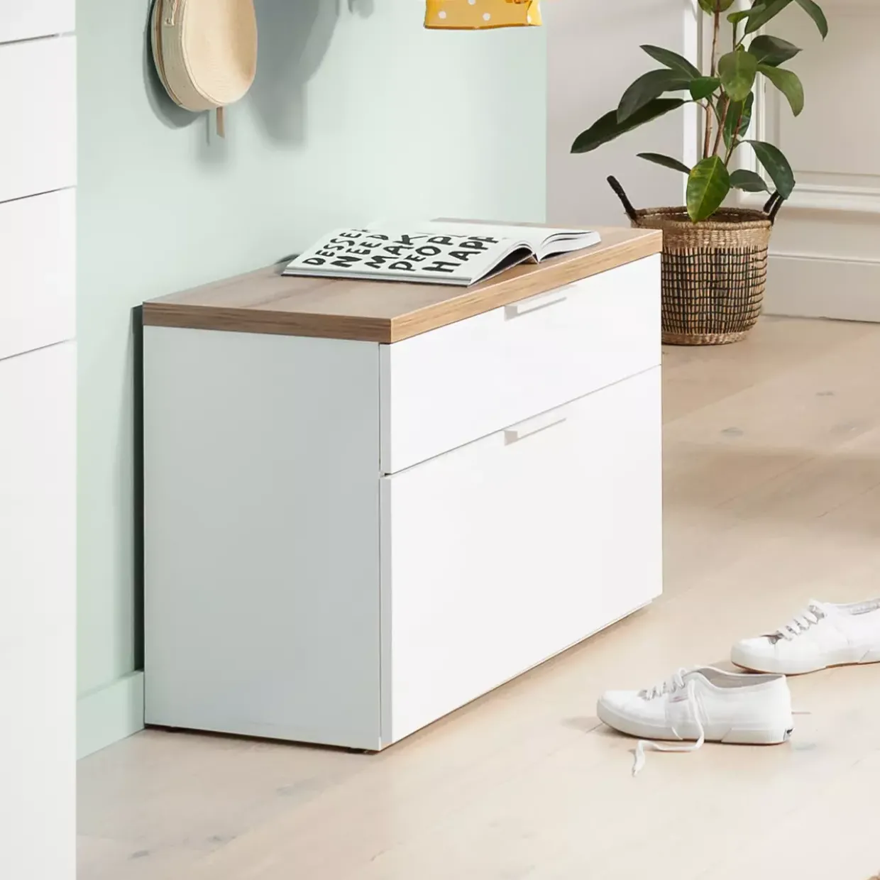 Entdecken Sie die elegante Garderobenbank Mundi, die mit ihrem konventionellen und Scandi-Stil in jedem Eingangsbereich oder Flur ein Highlight setzt. Die Kombination aus „Weiss Hochglanz“ und „Rivera Eiche“ verleiht dieser Bank eine zeitlose Eleganz, die sowohl modern als auch einladend wirkt. Das durchdachte Design fügt sich nahtlos in verschiedene Einrichtungsstile ein und setzt einen stilvollen Akzent in Ihrem Zuhause. Mundi ist mehr als nur eine Garderobenbank – sie ist ein Ausdruck von Stil und Funktionalität, die jeden Raum aufwertet.