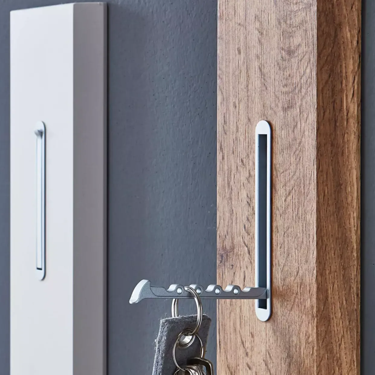 Besondere Highlights bei diesem Modell sind die praktischen Haken: Ein Klapphaken und drei Taschenhaken aus Aluminium in matt bieten vielseitige Aufhängemöglichkeiten. Diese durchdachte Ausstattung sorgt dafür, dass Jacken, Taschen und Accessoires stets griffbereit und ordentlich verstaut sind. Die klare Linienführung und die schlichte Farbgebung machen es leicht, das Garderobenelement mit anderen Möbelstücken zu kombinieren.