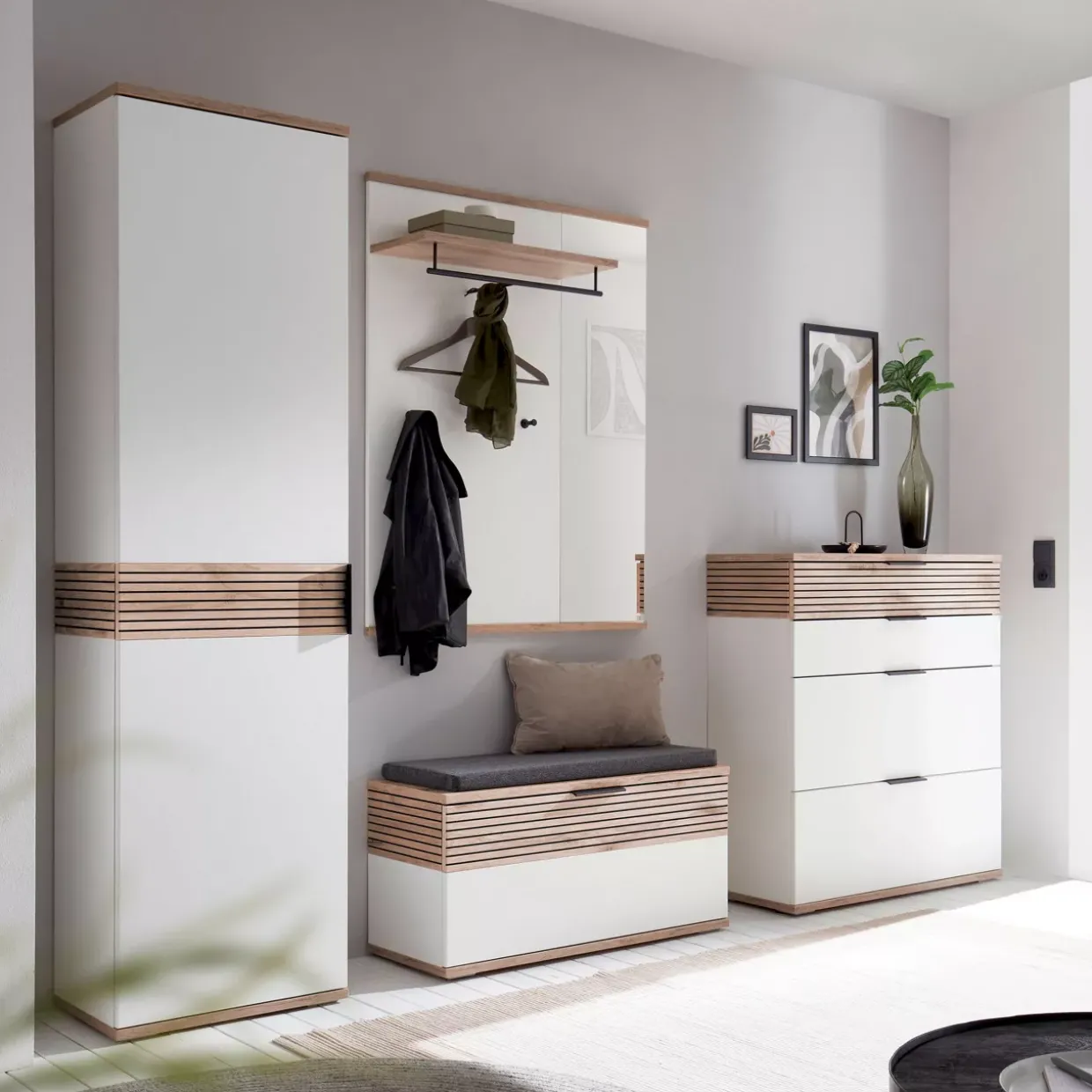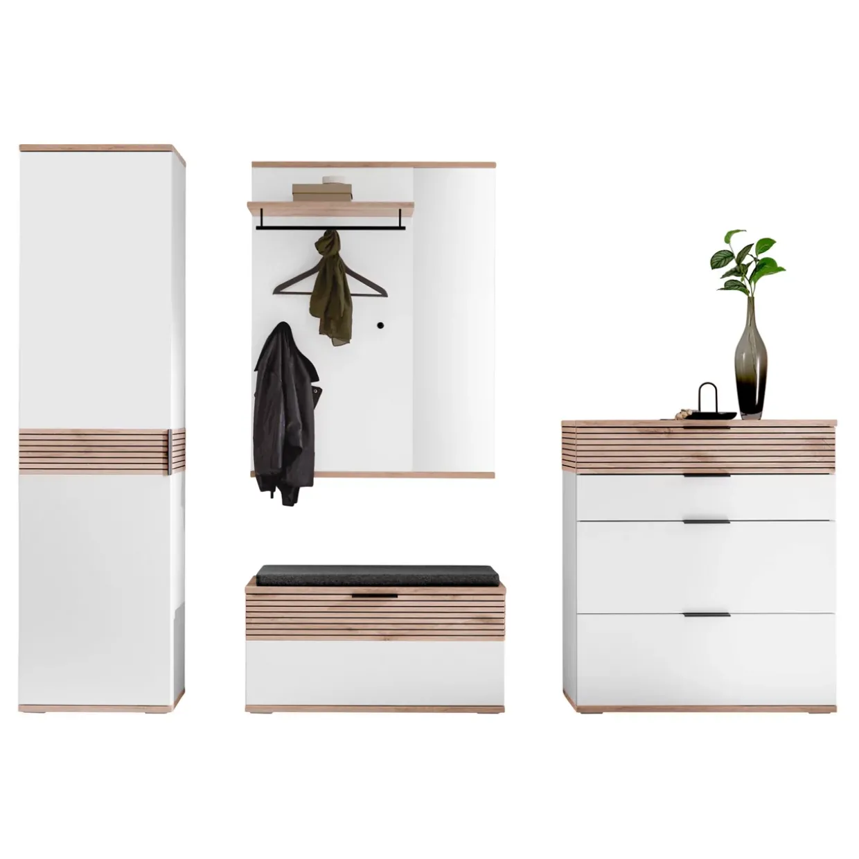 Ein harmonisches Zusammenspiel aus Form und Funktion bietet die Garderobenkombination mit ihren eleganten Rückwänden in soft white Nachbildung. Diese Kombination vereint ästhetisches Design mit praktischen Lösungen und ist ideal für jede Jahreszeit. Das Material aus hochwertigem Holzwerkstoff verleiht dem Möbelstück eine robuste und langlebige Struktur.Die tiefgezogene Absetzung in Viking Oak ergänzt das sanfte Weiß perfekt und schafft ein stimmiges Gesamtbild. Praktische Details wie Türdämpfer und eine ausziehbare Kleiderstange sorgen für zusätzlichen Komfort im Alltag. Dank des Soft-Close-Systems schließen die Türen sanft und leise, was die Langlebigkeit der Konstruktion unterstützt.Ein weiteres Highlight sind die schwarzgrauen Metallakzente, die den konventionellen Stil modern aufwerten. Die Garderobenkombination überzeugt durch ihre durchdachte Unterführung, die gedämpft ist und somit für einen stabilen Stand sorgt. Griffe und Haken sind nicht nur funktional, sondern runden das Design gekonnt ab.Diese Kombination bietet nicht nur ausreichend Platz für Ihre Garderobe, sondern auch eine stilvolle Präsentation Ihrer Kleidung. Eine ideale Lösung für all jene, die Wert auf Qualität und Design legen, ohne auf Funktionalität zu verzichten.