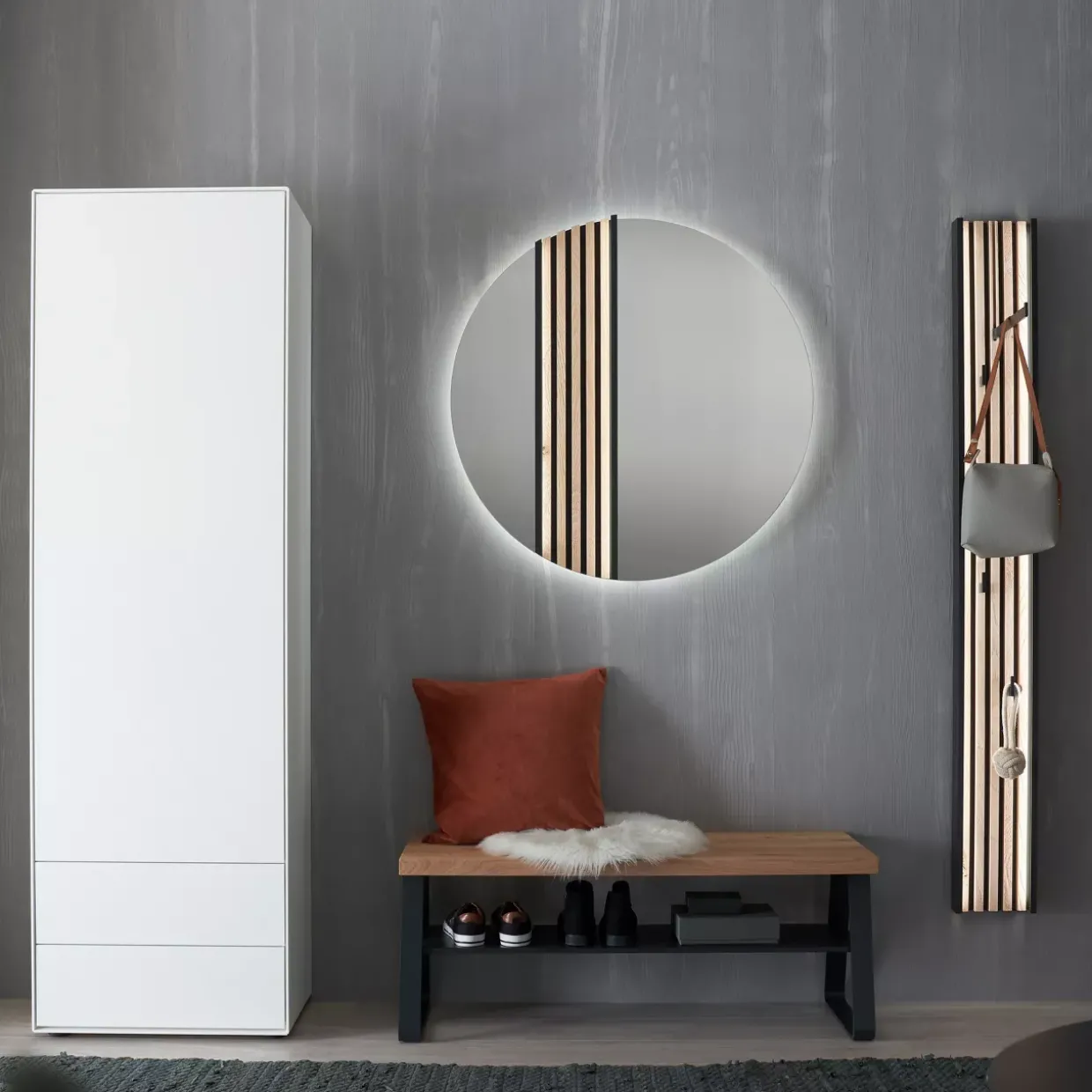 Die Bank mit ihren anthrazitfarbenen Metallkufen und einem Ablageboden aus Metall strahlt schlichte Eleganz aus und bietet zusätzlichen Platz. Dazu passend, die Wandgarderobe mit Lamellenrückwand, einem klappbaren Mantelhaken und vier weiteren Haken, die für Ordnung sorgen und gleichzeitig als dekorative Elemente dienen.
