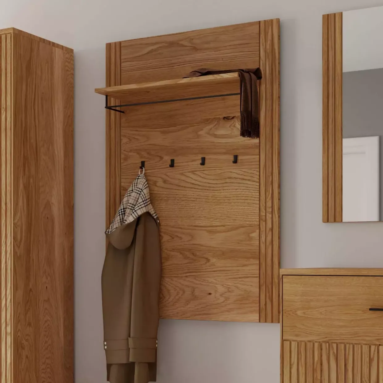 Das Garderobenpaneel Martha ist ein Paradebeispiel für funktionales Design. Mit seiner furnierten Oberfläche fügt es sich nahtlos in unterschiedlichste Einrichtungsstile ein und bietet gleichzeitig eine praktische Aufbewahrungslösung für Jacken, Hüte und Accessoires.