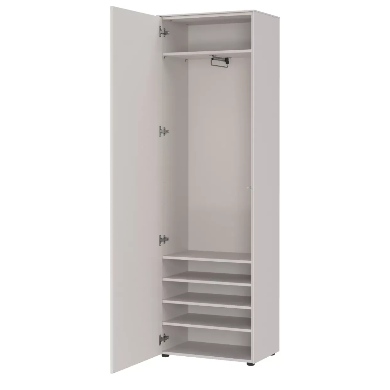 Kratzfeste und widerstandsfähige Oberflächenbeschichtungen garantieren eine lange Lebensdauer dieses modernen Garderobenschranks. Die melaminharzbeschichtete Oberfläche verleiht dem Möbelstück nicht nur ein ansprechendes Äußeres, sondern sorgt auch für einfache Pflege, da sie mit einem trockenen Tuch leicht gereinigt werden kann.