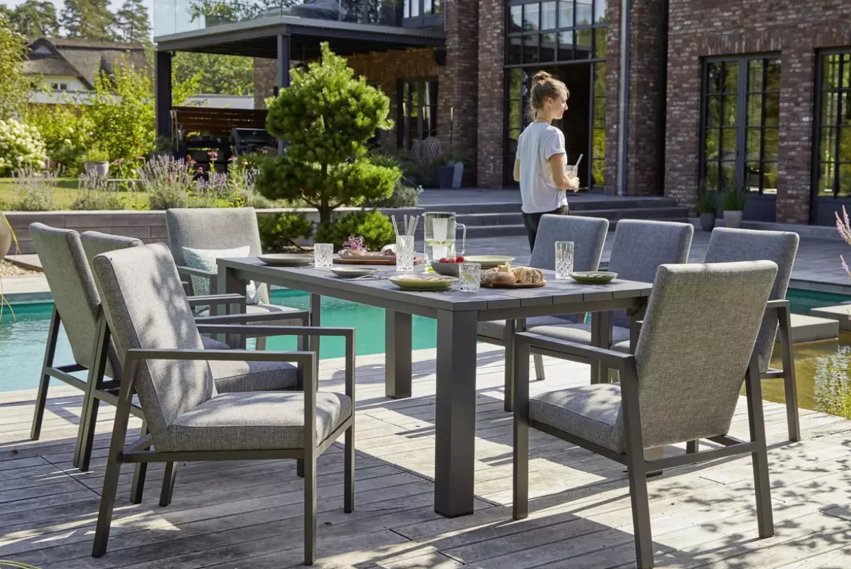 Aluminium, bekannt für seine Langlebigkeit und Widerstandsfähigkeit, sorgt dafür, dass der Gartenstuhl wetterfest und pflegeleicht ist. Der Stoffbezug ergänzt das hochwertige Erscheinungsbild und bietet eine angenehme Haptik.