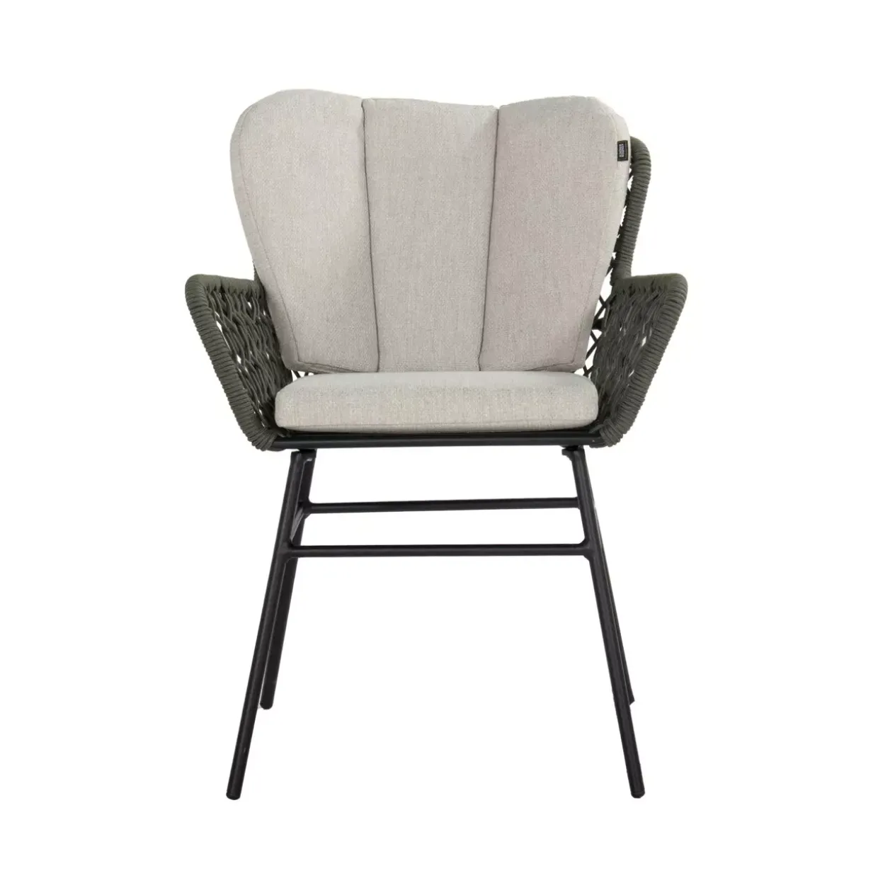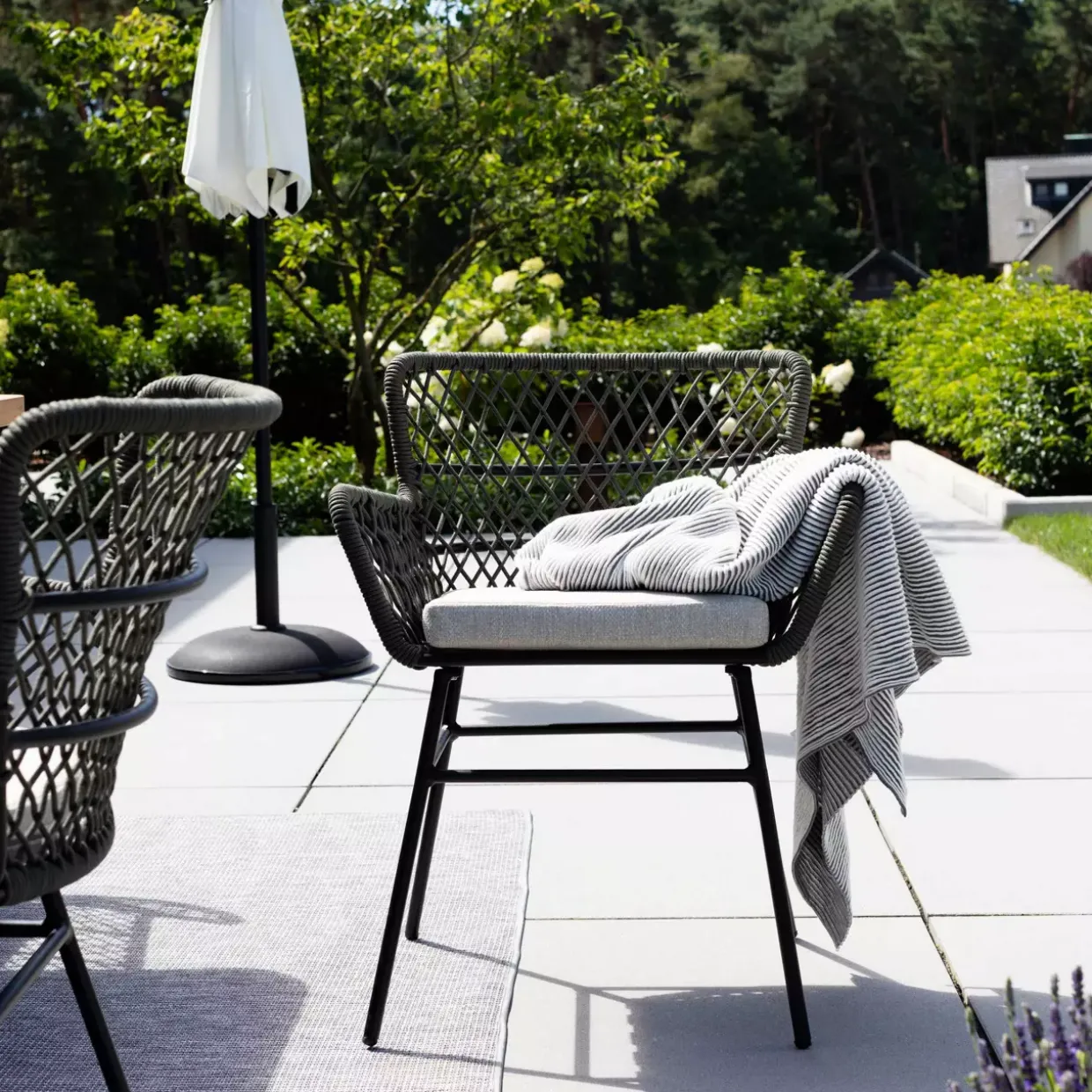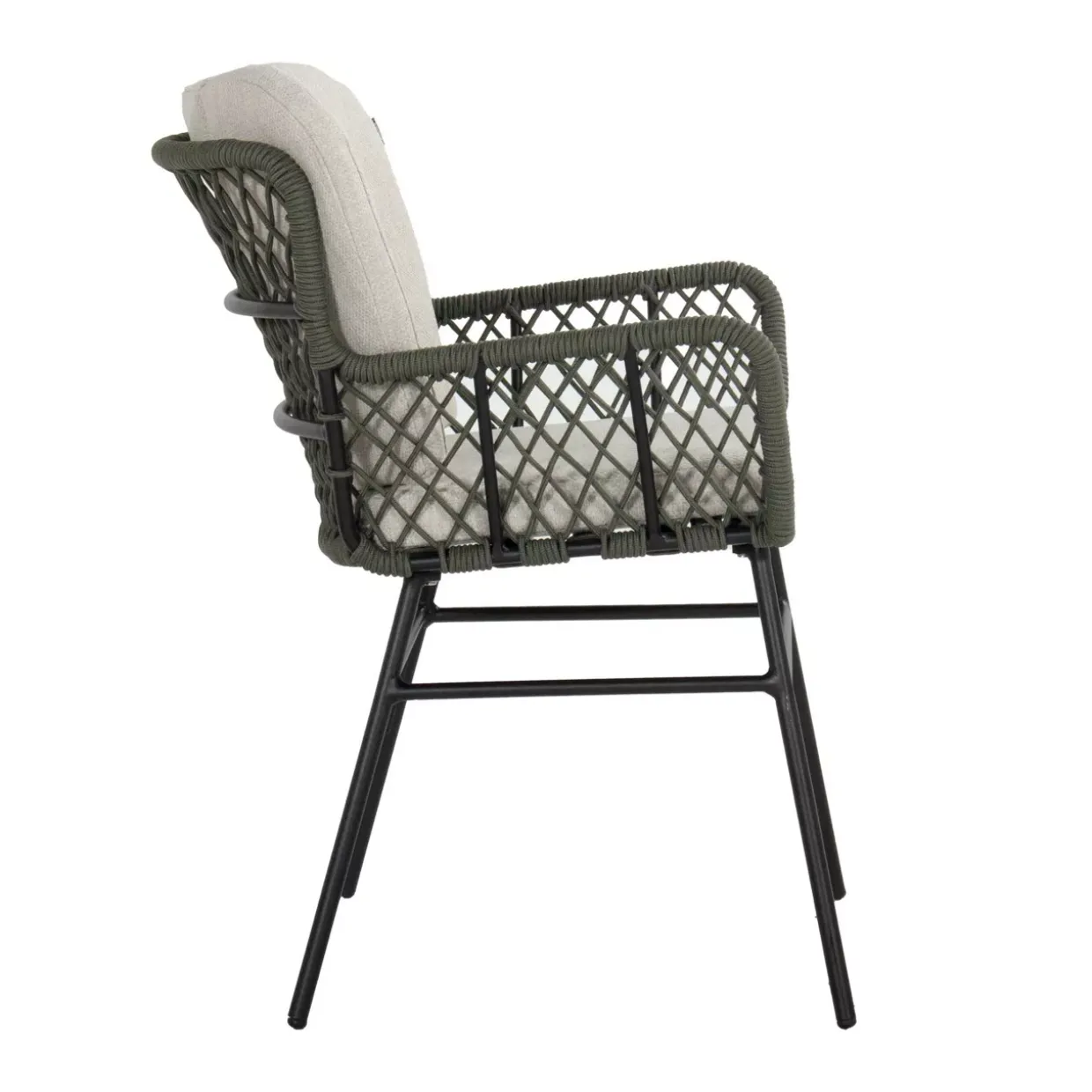 Eine Sitzschale aus Rope-Geflecht verleiht diesem Gartenstuhl einen modernen und eleganten Look. Das Zusammenspiel von Textil und Metall sorgt für eine harmonische Verbindung von Komfort und Stabilität. Ein 4-Fußgestell aus hochwertigem Aluminium bietet eine stabile Grundlage und verspricht Langlebigkeit, selbst bei intensiver Nutzung im Freien.Mit seinen Armlehnen lädt der Stuhl zum entspannten Verweilen ein. Die graue Farbgebung und das schwarz pulverbeschichtete Gestell ergänzen sich perfekt und fügen sich nahtlos in moderne Außenbereiche ein. Darüber hinaus sorgt das mitgelieferte Kissen für zusätzlichen Sitzkomfort und macht den Aufenthalt im Garten noch angenehmer.Der Einsatz von sonstigen Fasern in der Textilart bietet eine weiche Haptik und ist gleichzeitig pflegeleicht. So bleibt der Gartenstuhl auch nach längerem Gebrauch ansprechend und funktional. Seine stilvolle Erscheinung und die besonderen Materialkombinationen machen diesen Stuhl zu einem idealen Begleiter für entspannte Stunden im Freien.Dieser Gartenstuhl vereint auf gelungene Weise Ästhetik und Funktionalität. Lassen Sie sich von der zeitgemäßen Gestaltung inspirieren und genießen Sie die Ruhe im eigenen Garten mit einem Möbelstück, das sowohl optisch als auch praktisch überzeugt.