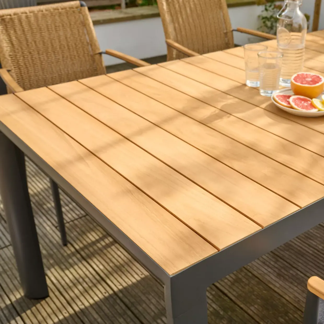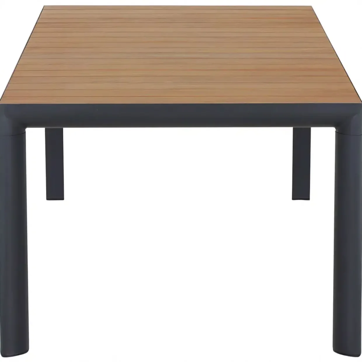 Der Kontrast zwischen dem warmen Ton des Teakholzes und dem kühlen Metall in Anthrazit verleiht dem Tisch eine besondere Ästhetik, die sowohl im Innen- als auch im Außenbereich eine gute Figur macht. Dank der pulverbeschichteten Oberfläche ist der Tisch besonders pflegeleicht und widerstandsfähig gegen Umwelteinflüsse.