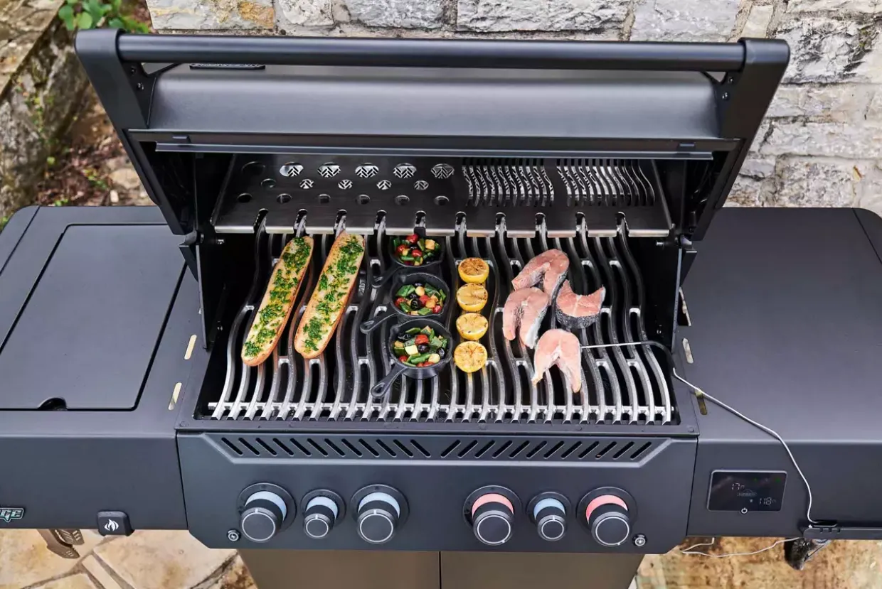 WLAN- und Bluetooth-Konnektivität eröffnen neue Möglichkeiten des Grillens. Der moderne Grill im mattschwarzen Design aus robustem Edelstahl vereint Funktionalität und Stil. Der integrierte LCD-Display ermöglicht die Fernüberwachung der Temperatur und unterstützt Sie mit einer praktischen Grillhilfe. Innovative Roste aus gegossenem Edelstahl sorgen für optimale Hitzeverteilung und ein gleichmäßiges Grillergebnis. Ein besonderes Highlight ist die SIZZLE ZONE mit Infrarot-Seitenbrenner, die ein schnelles Anbraten ermöglicht. Der Heckbrenner erweitert die Zubereitungsmöglichkeiten zusätzlich. Dank der fixierbaren Lenkrollen nach Industriestandards lässt sich der Grill leicht bewegen und sicher platzieren. Die integrierten, abgeschirmten Anschlüsse für Temperaturfühler gewährleisten eine präzise Überwachung der Garprozesse. Sechs versteckte Werkzeughaken bieten praktischen Stauraum für Ihr Grillzubehör. Für Sicherheit und Komfort sorgen die LED-Kontrollknöpfe mit SafetyGlow-Funktion: Blau signalisiert ausgeschaltete Brenner, während Rot auf in Betrieb befindliche Brenner hinweist. Die Jetfire Zündung für die Hauptbrenner und das elektronische Zündsystem für die Sizzle Zone und den Infrarot-Heckbrenner garantieren eine zuverlässige Inbetriebnahme. Der Phantom verspricht ein herausragendes Grillerlebnis mit modernster Technologie und durchdachtem Design.