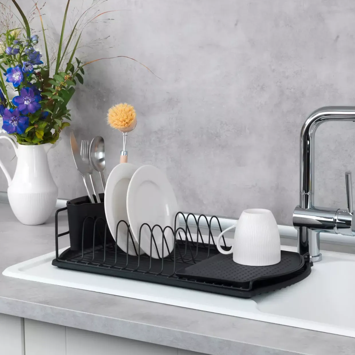 In klassischem Schwarz gehalten, fügt sich der Geschirrabtropfer harmonisch in jedes Farbschema ein. Das Gestell, der Besteckkorb und das Tablett sind in einer einheitlichen Farbgebung gestaltet, was für eine stilvolle Optik sorgt. Diese geschmackvolle Farbwahl unterstützt eine klare und aufgeräumte Küchenatmosphäre.