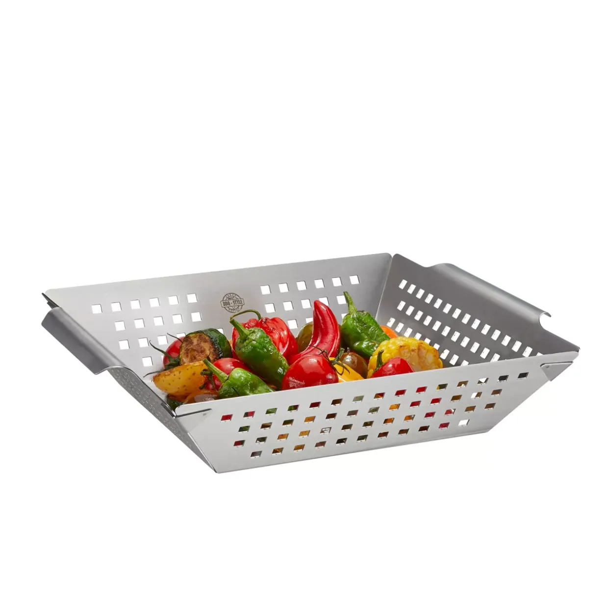 Edelstahl trifft auf modernes Design: Die silberne Grillschale im Modell BBQ verbindet Funktionalität mit zeitgemäßer Ästhetik. Gemüse, Fisch oder Rosmarinkartoffeln – all diese Köstlichkeiten gelingen perfekt in dieser Grillschale. Die quadratischen Öffnungen in Boden und Seitenwänden spielen eine entscheidende Rolle, indem sie für eine optimale Hitzezirkulation sorgen.