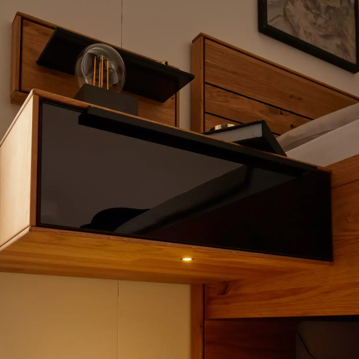 Besonders in kleineren Räumen ist die Hängekonsole eine praktische Lösung, da sie wertvollen Bodenplatz freihält. An der linken Wandseite angebracht, bietet sie eine stilvolle Möglichkeit, Ihre Lieblingsgegenstände zu präsentieren oder alltägliche Dinge griffbereit zu halten. Der Einsatz von geöltem Holz sorgt zudem für eine pflegeleichte und langlebige Oberfläche, die den Charme des Naturmaterials hervorhebt.
