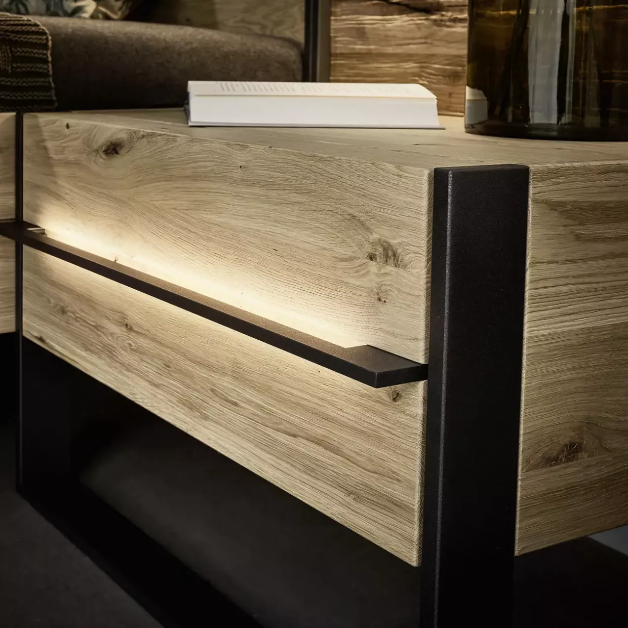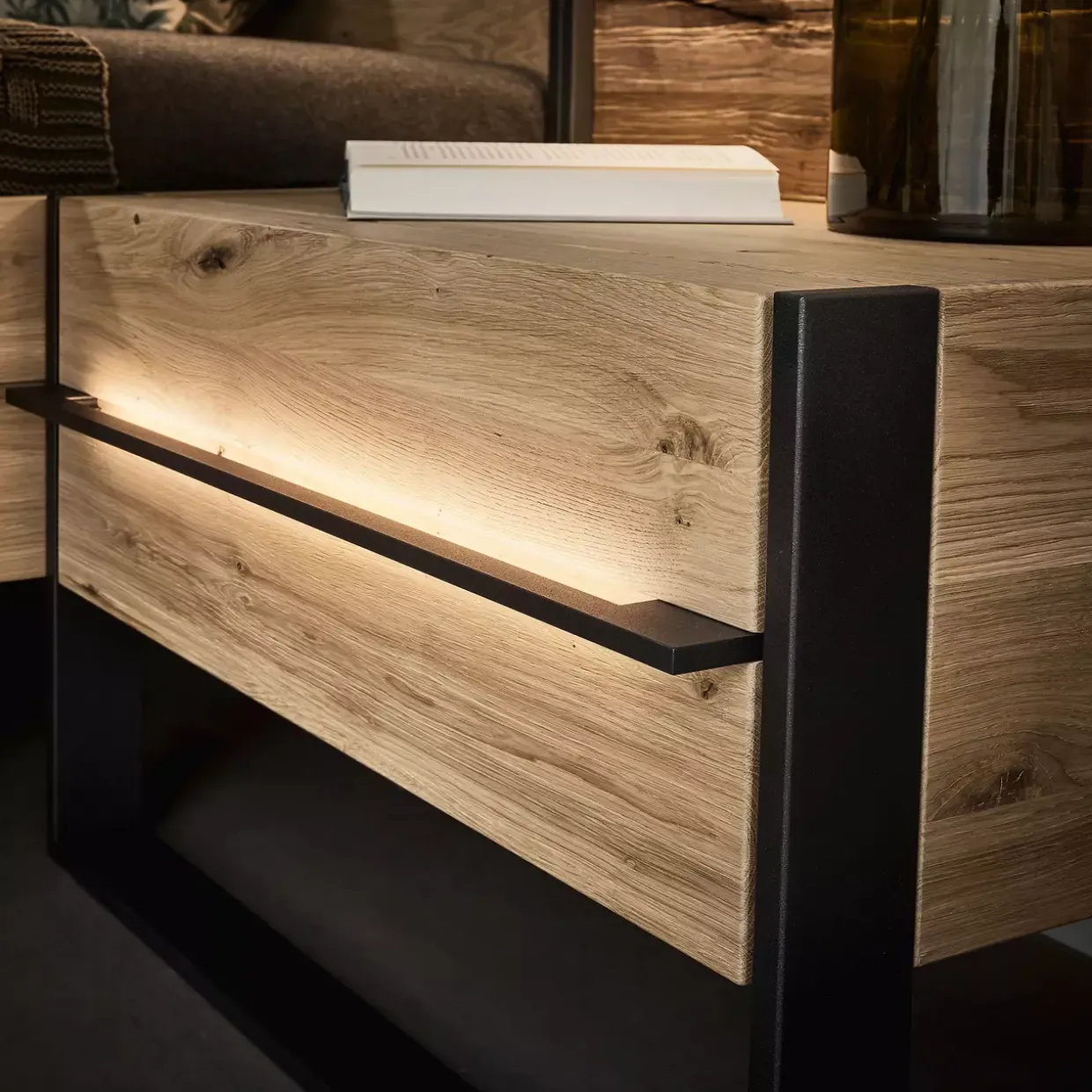 Die Steel Hängekonsole verbindet urbanen Charme mit natürlicher Eleganz, was sie zu einem idealen Möbelstück im Loft-Stil macht. Die Kombination aus robustem Metall und edlem Holz verleiht diesem Möbelstück eine einzigartige Ausstrahlung. Besonders die gebürstete Wildeiche sorgt für eine warme, einladende Atmosphäre, während die Lackierung in Eisenglimmer einen industriellen Touch hinzufügt.