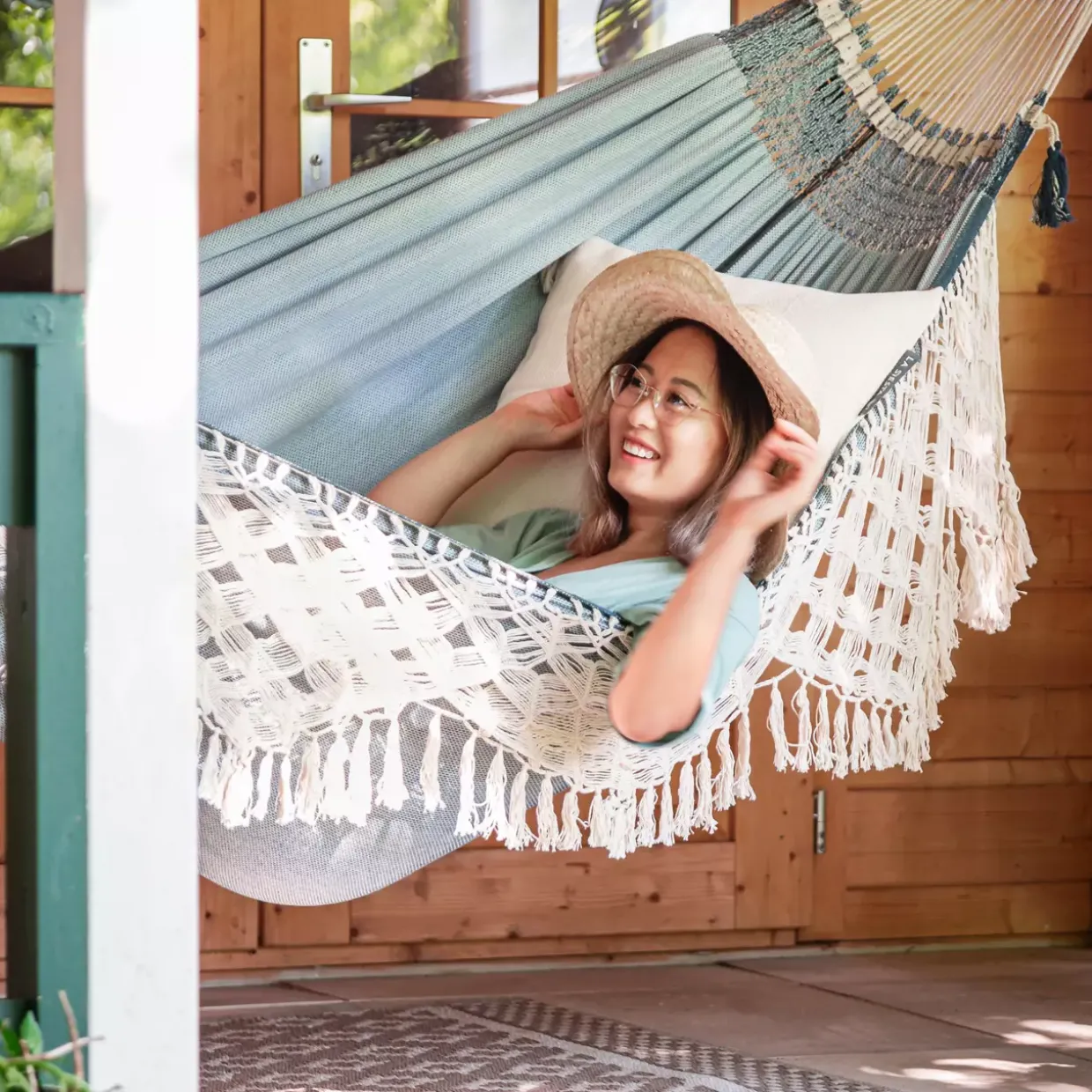 Lassen Sie sich von der Balance aus Stil, Farbe und Material inspirieren und genießen Sie die kleinen Auszeiten des Alltags in einer Hängematte der besonderen Art.