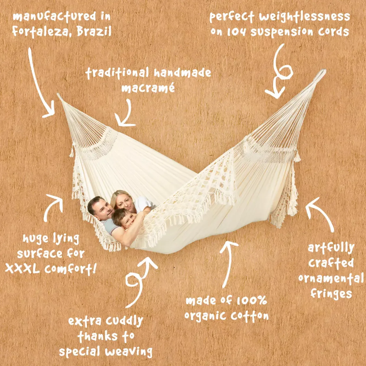 Das Modell Bossanova überzeugt durch seine schlichte Eleganz und die sorgfältige Verarbeitung. Die Farbgebung in Latte strahlt Ruhe und Gelassenheit aus und lädt zum Verweilen ein. Durch das robuste Textil eignet sich die Hängematte sowohl für den täglichen Gebrauch als auch für besondere Momente der Entspannung.